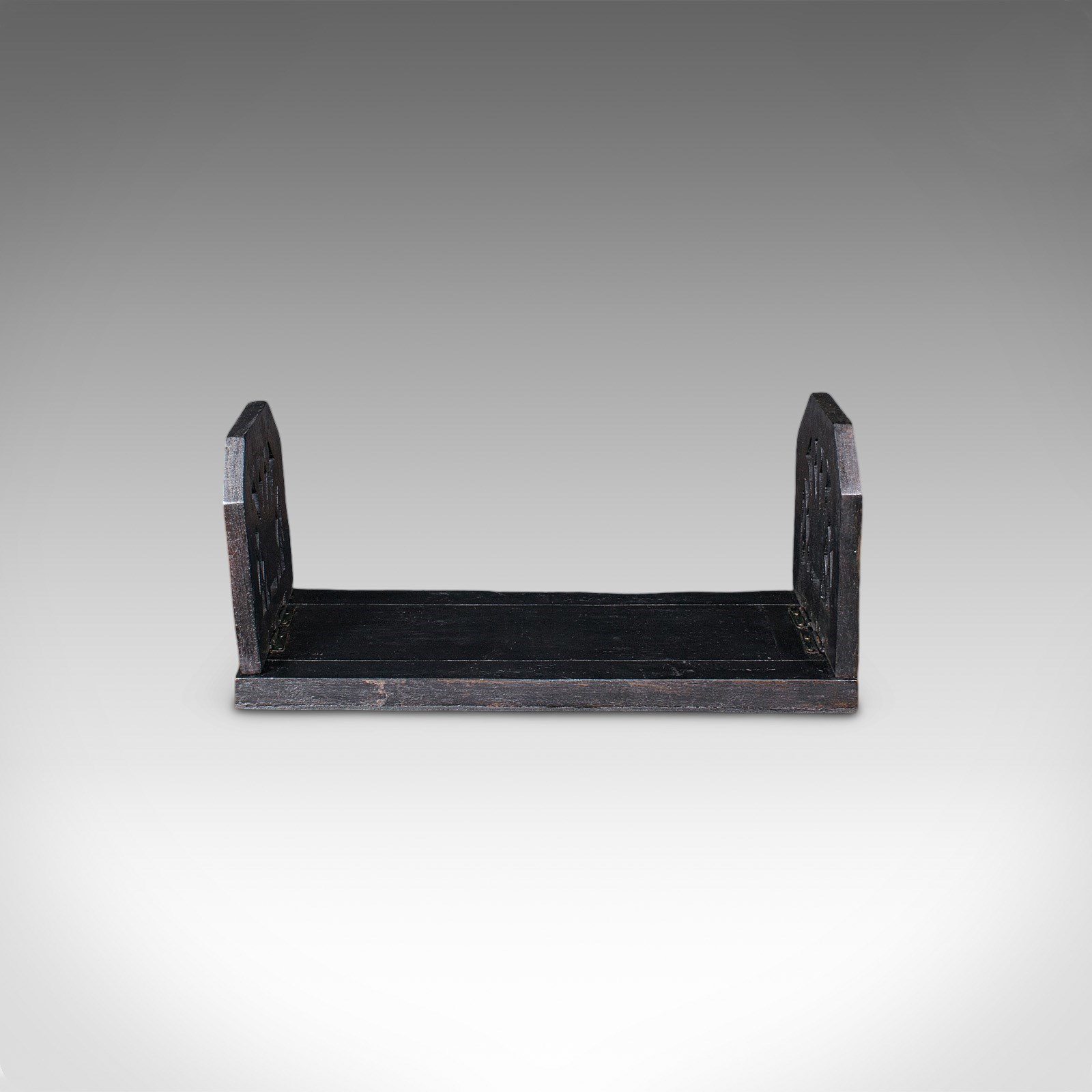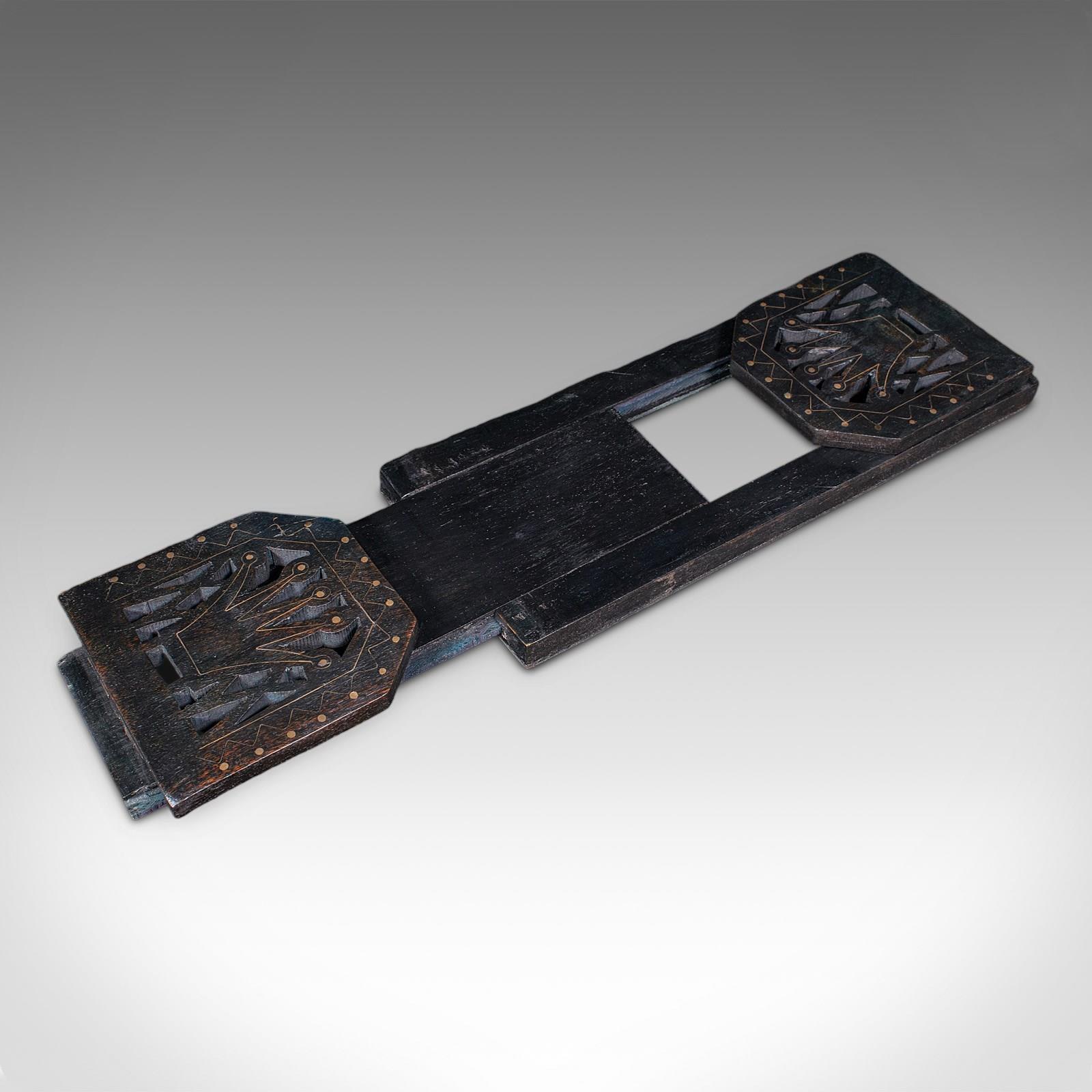 This is an antique extending book slide. An English, ebonised mahogany novel rest, dating to the Victorian period, circa 1870. A striking and practical desk accessory, with a dark aesthetic and refined decorative detail.