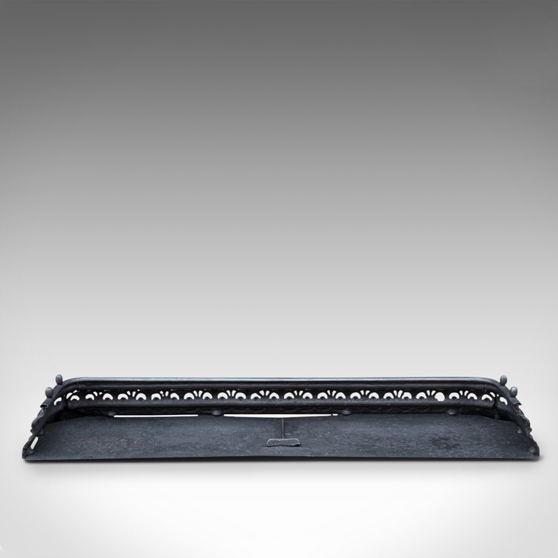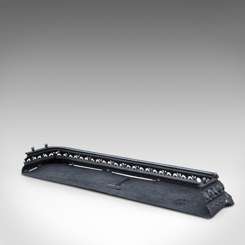 This is an antique fire kerb and companion tongs. An English, iron fireside set, dating to the Victorian period, circa 1850.
