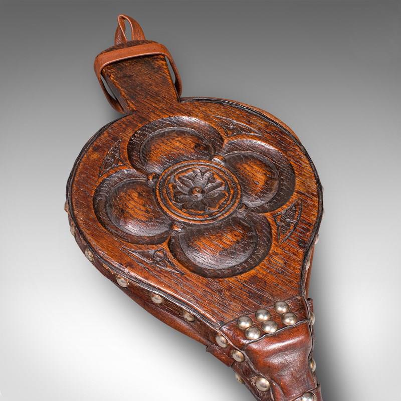 This is an antique fireplace bellows. An English, oak and leather fire stoking tool, dating to the late Victorian period, circa 1880. Wonderfully preserved, it combines practical fire-lighting function with superb decorative presence in the Gothic Revival taste.