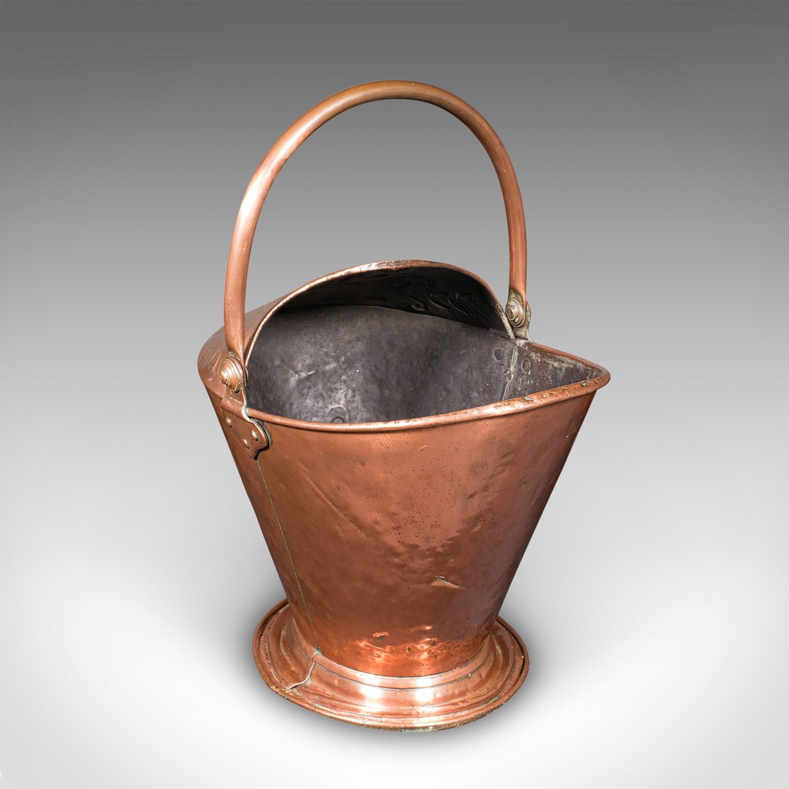This is an antique fireplace coal scuttle. An English, copper fire basket in Art Nouveau taste, dating to the late Victorian period, circa 1900. A charmingly decorative example with an elegant hooded profile and warm copper tones.