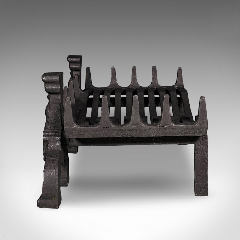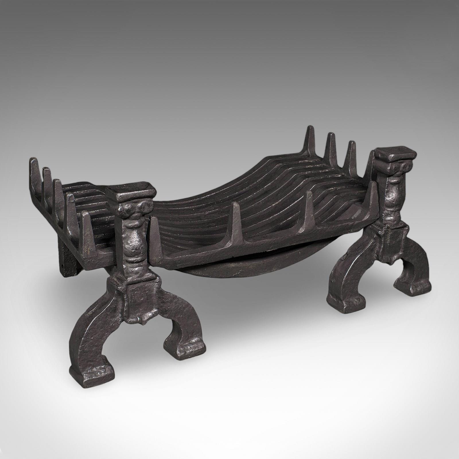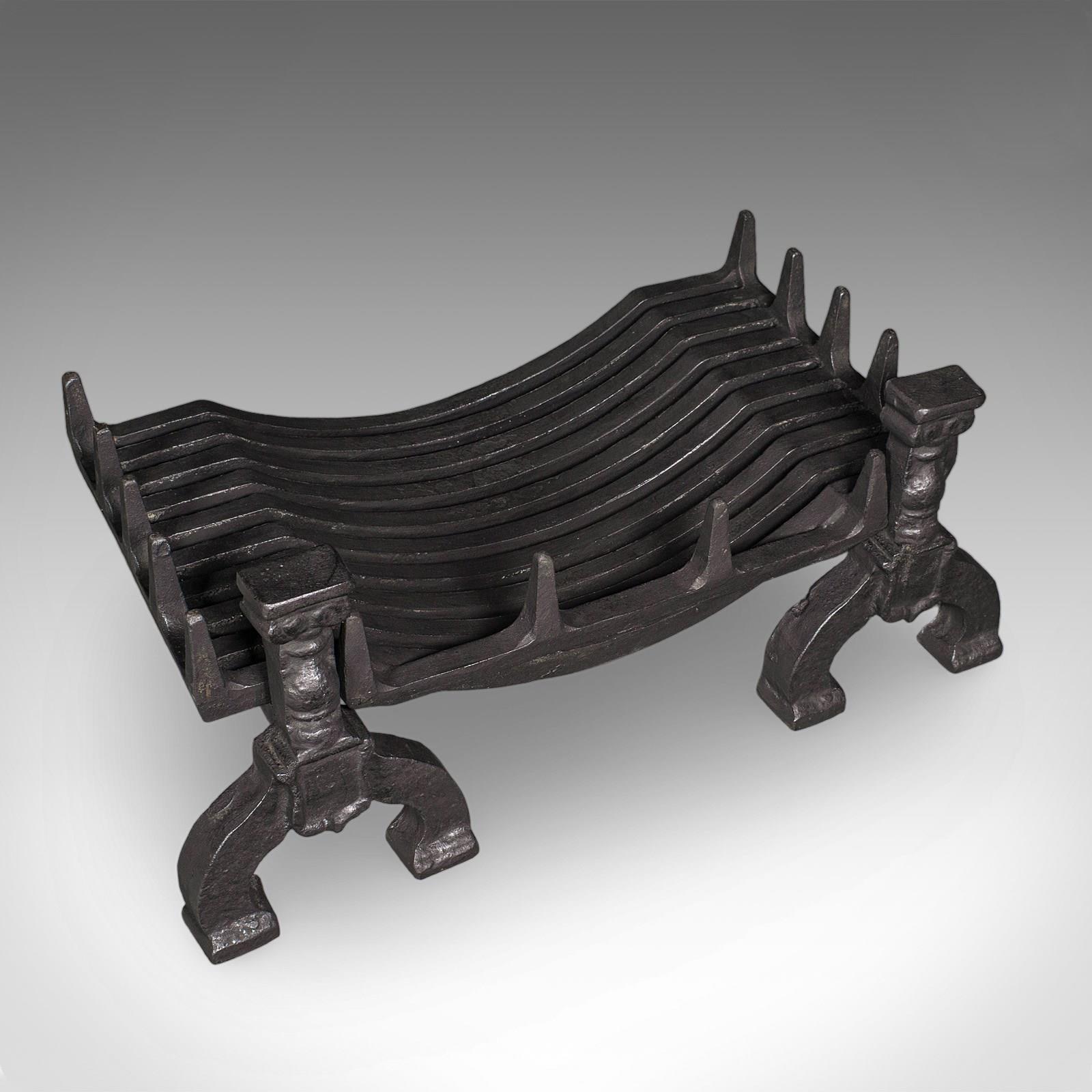 This is an antique fireplace hearth set. An English, heavy cast iron fire basket and andirons, dating to the Victorian period, circa 1870.