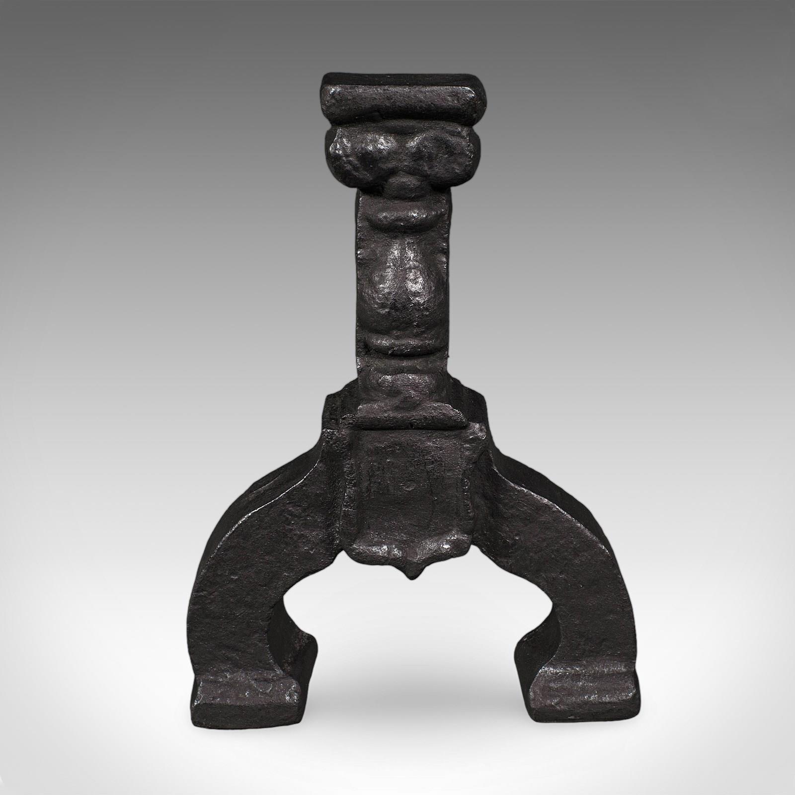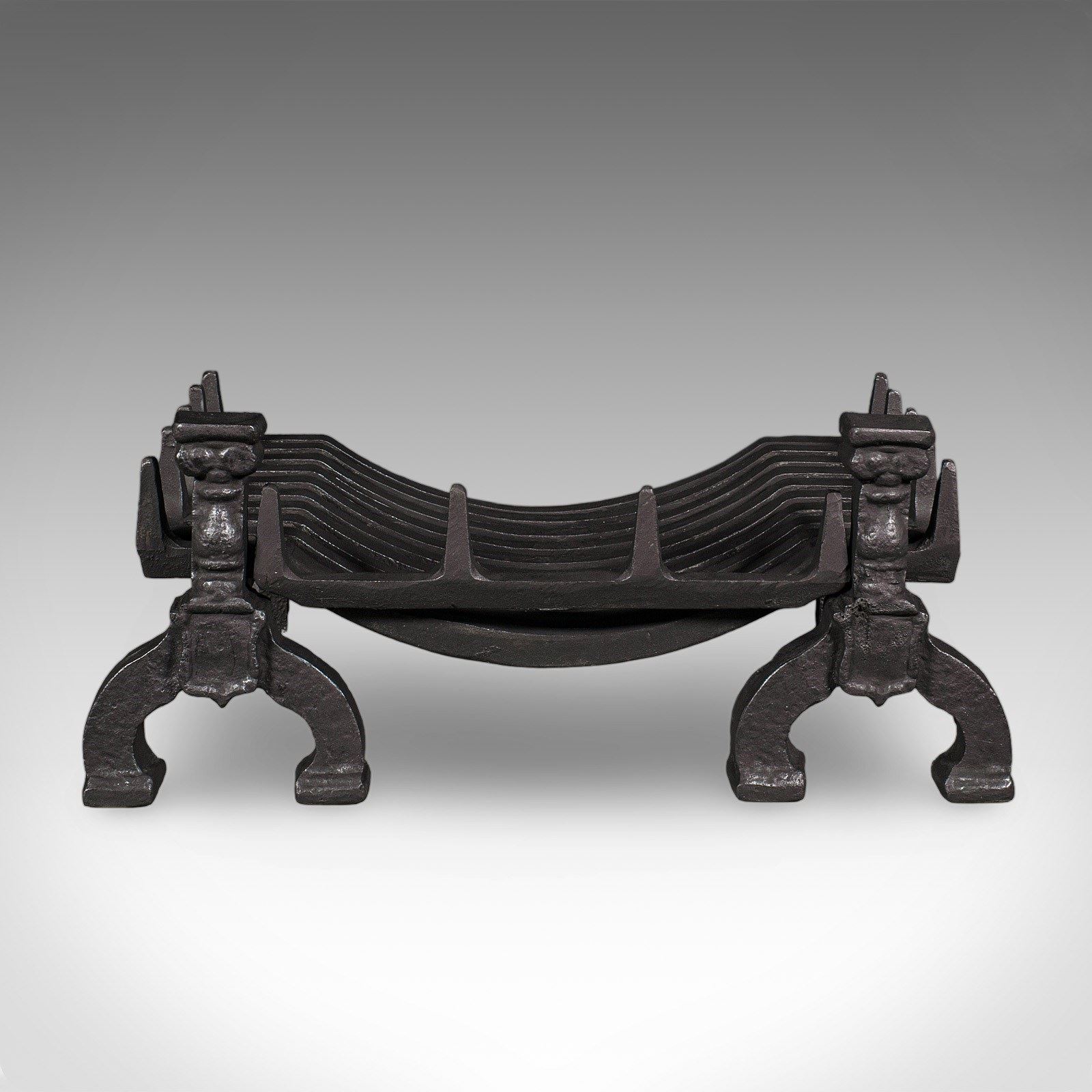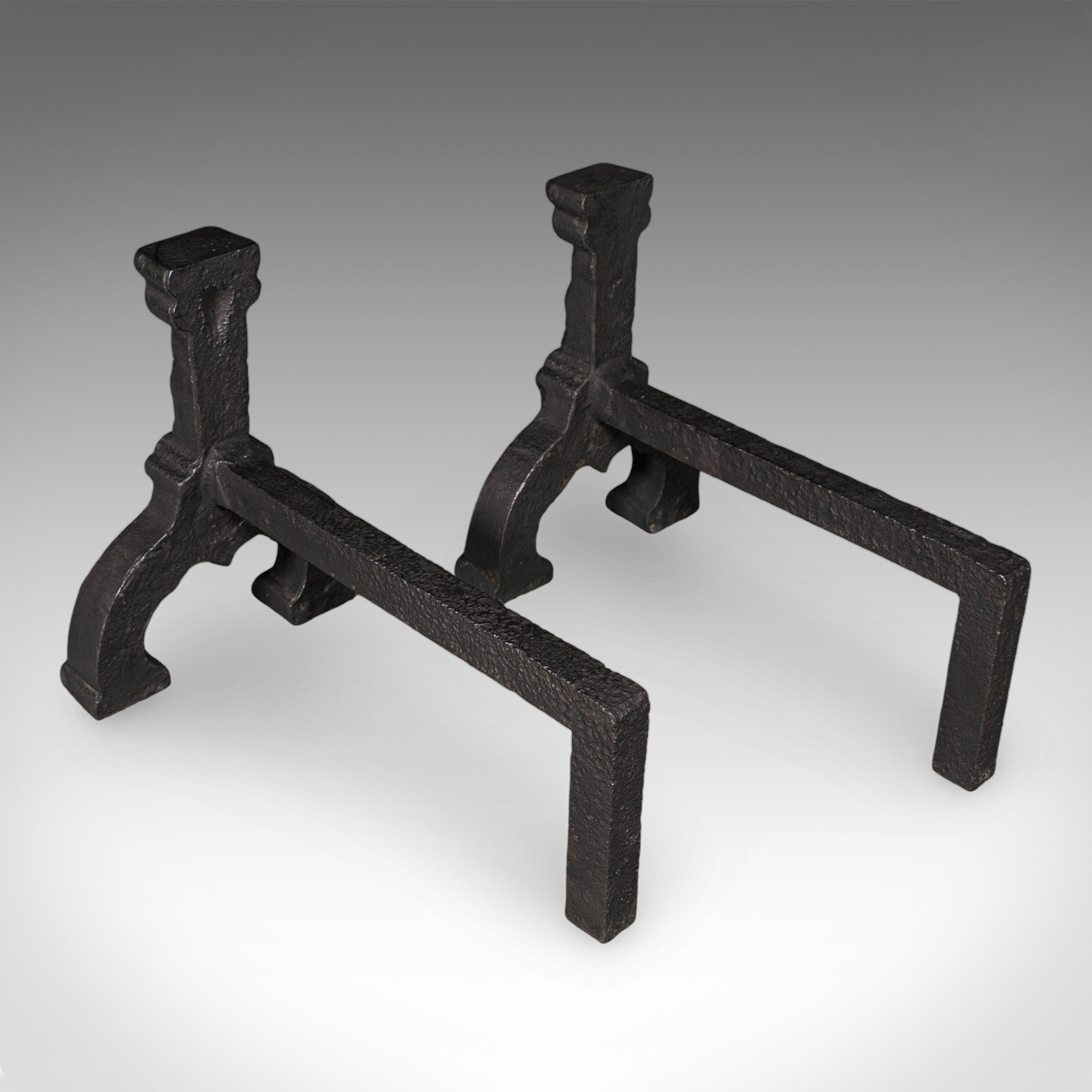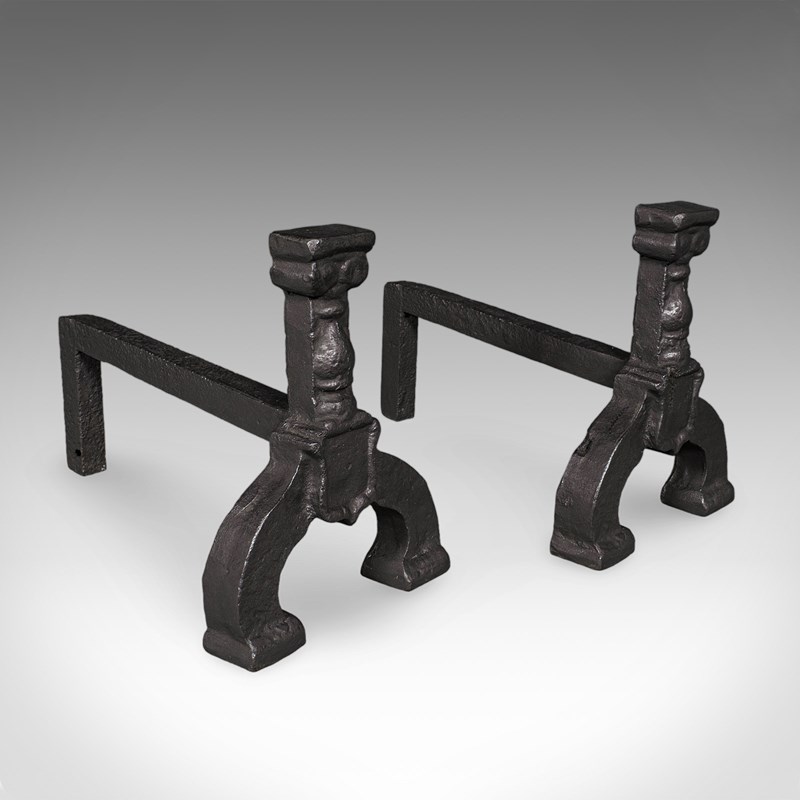 Broad andirons stand upon arched legs with traditional decorative motif