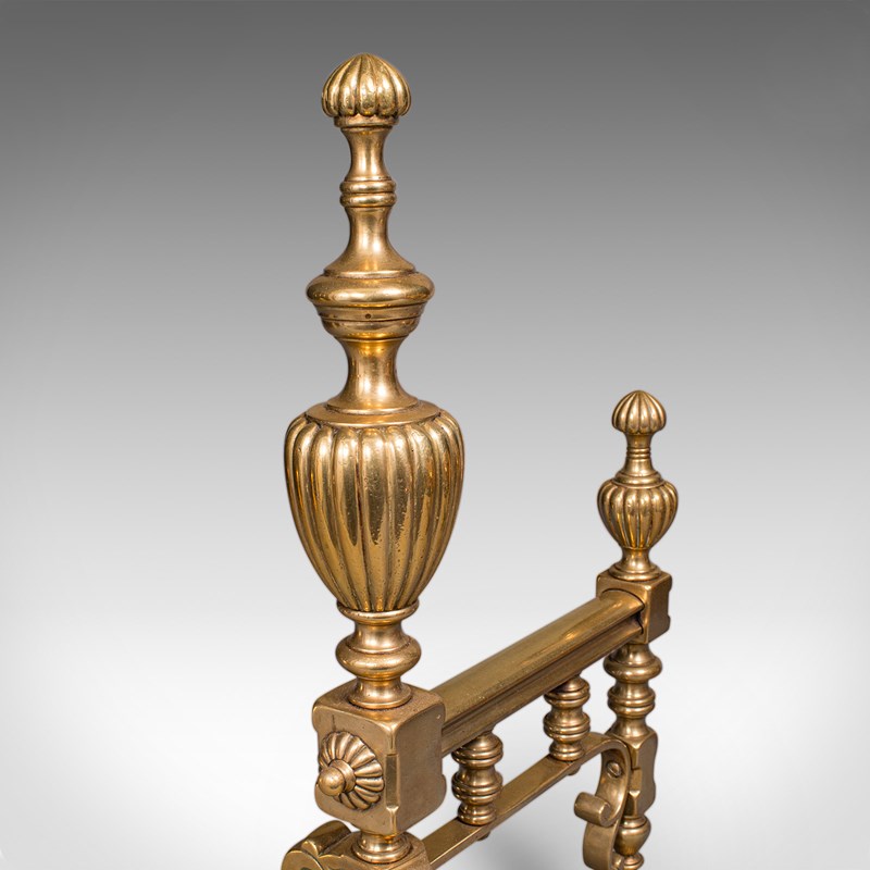 This is an antique fireplace tool suite. An English, brass shovel, poker and tong set with accompanying tool rests, dating to the mid Victorian period, circa 1870. An exceptional example of Victorian fireplace furnishing, offering refined craftsmanship and elegant presentation.