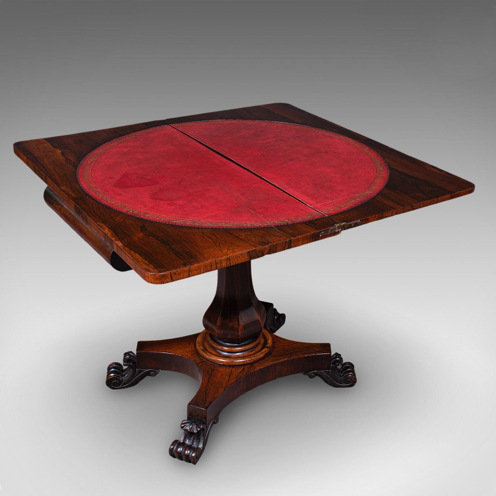 This is an antique fold-over card table. An English, rosewood games or console table, dating to the early Victorian period, circa 1840.