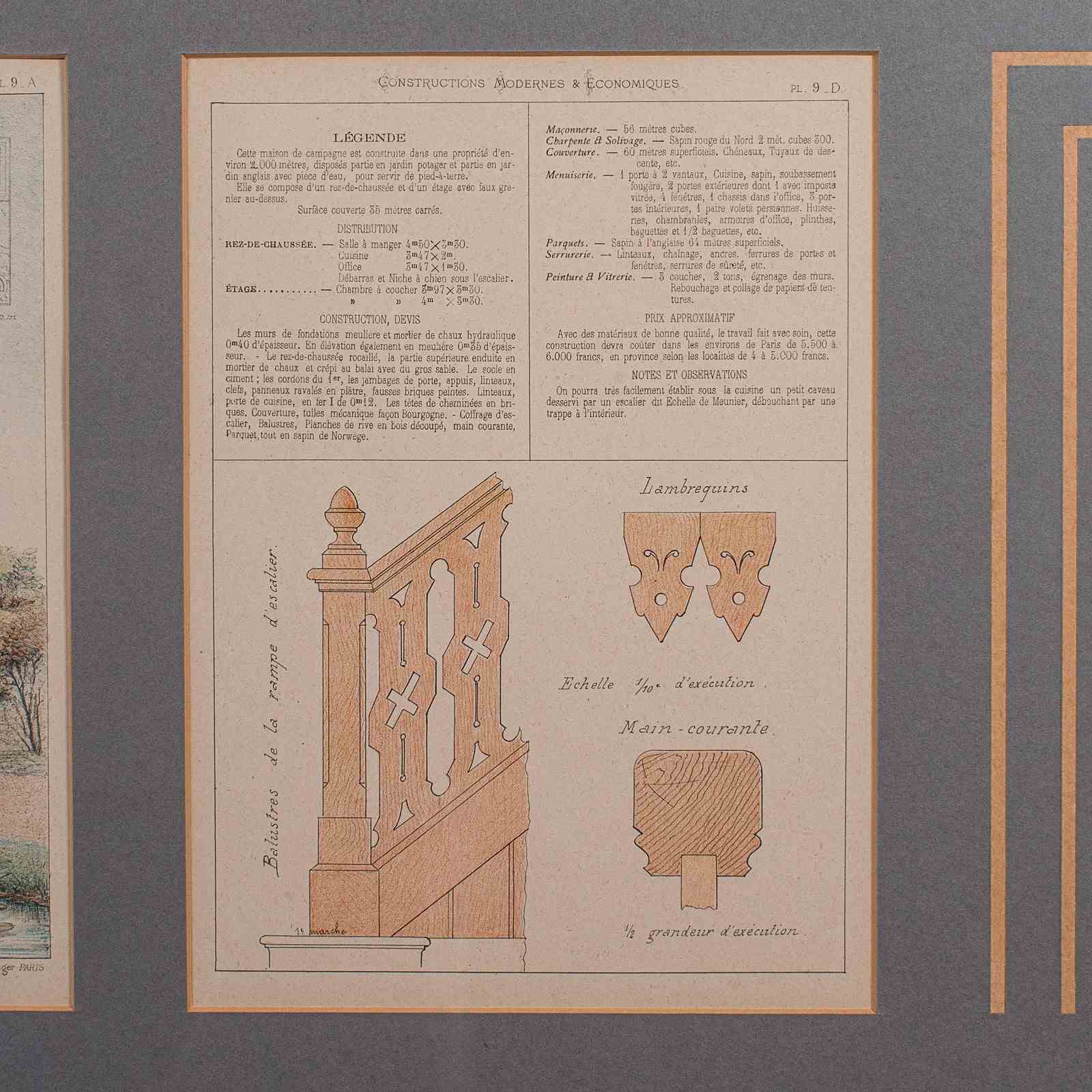 This is an antique framed architectural plan. A French, lithograph set of drawings from Constructions Modernes et Economiques, dating to the late Victorian period, circa 1900.