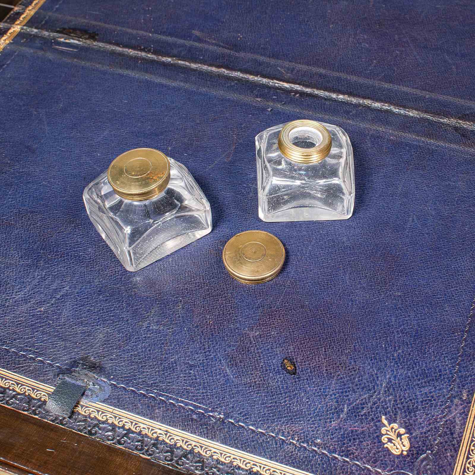 Pen tray with removable cover sits neatly between a pair of brass-collared, glass ink wells