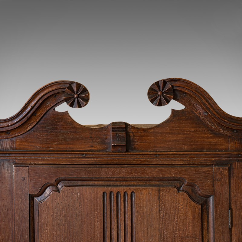An elegant, carved swan neck pediment graces the top of the cabinet