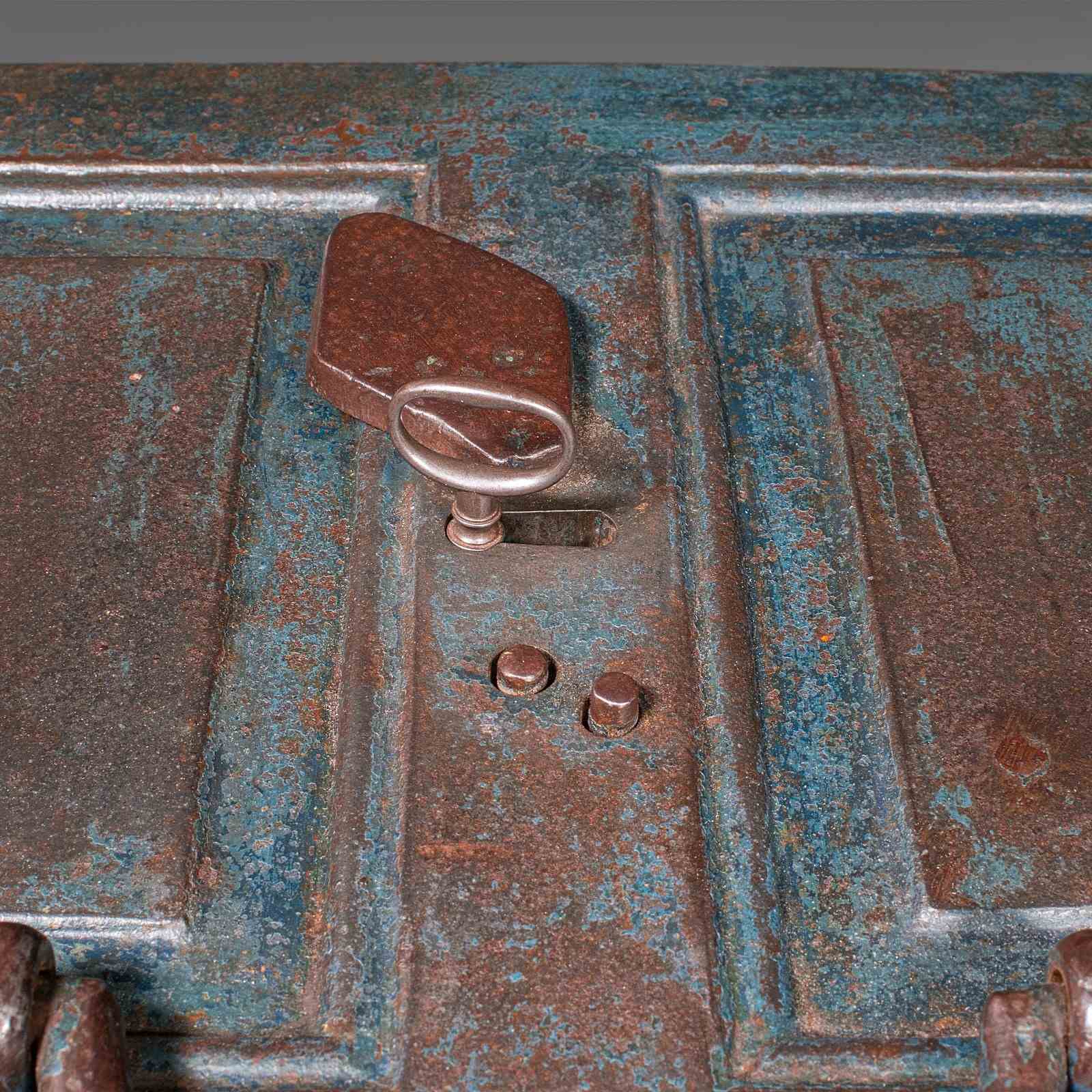 A striking Victorian cast iron strong box, rich in patina and period charm, this example would make a wonderful addition to a study, library, or retail interior. Perfect for those seeking authentic antique character and robust craftsmanship in a decorative yet practical piece. Delivered ready for the home or establishment.