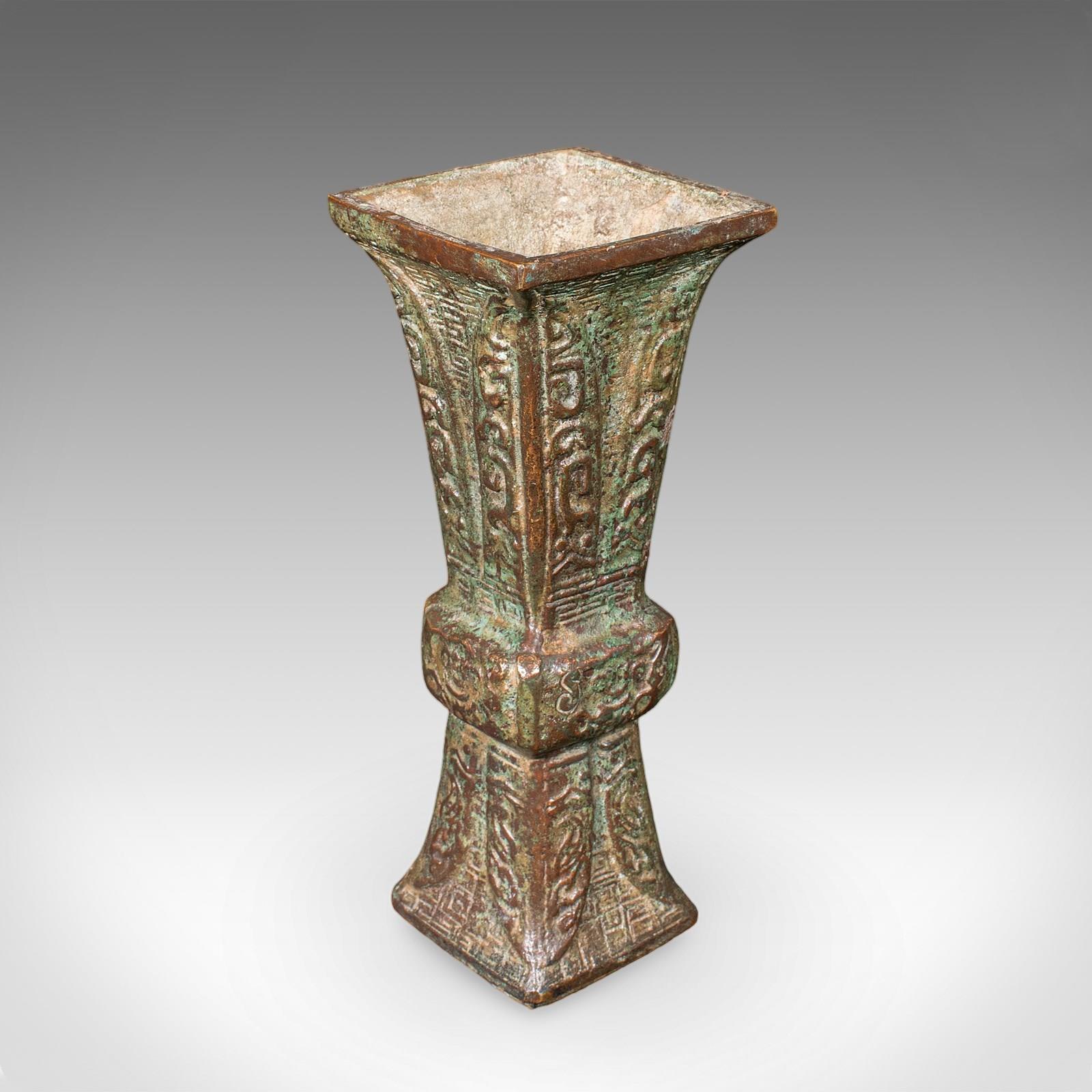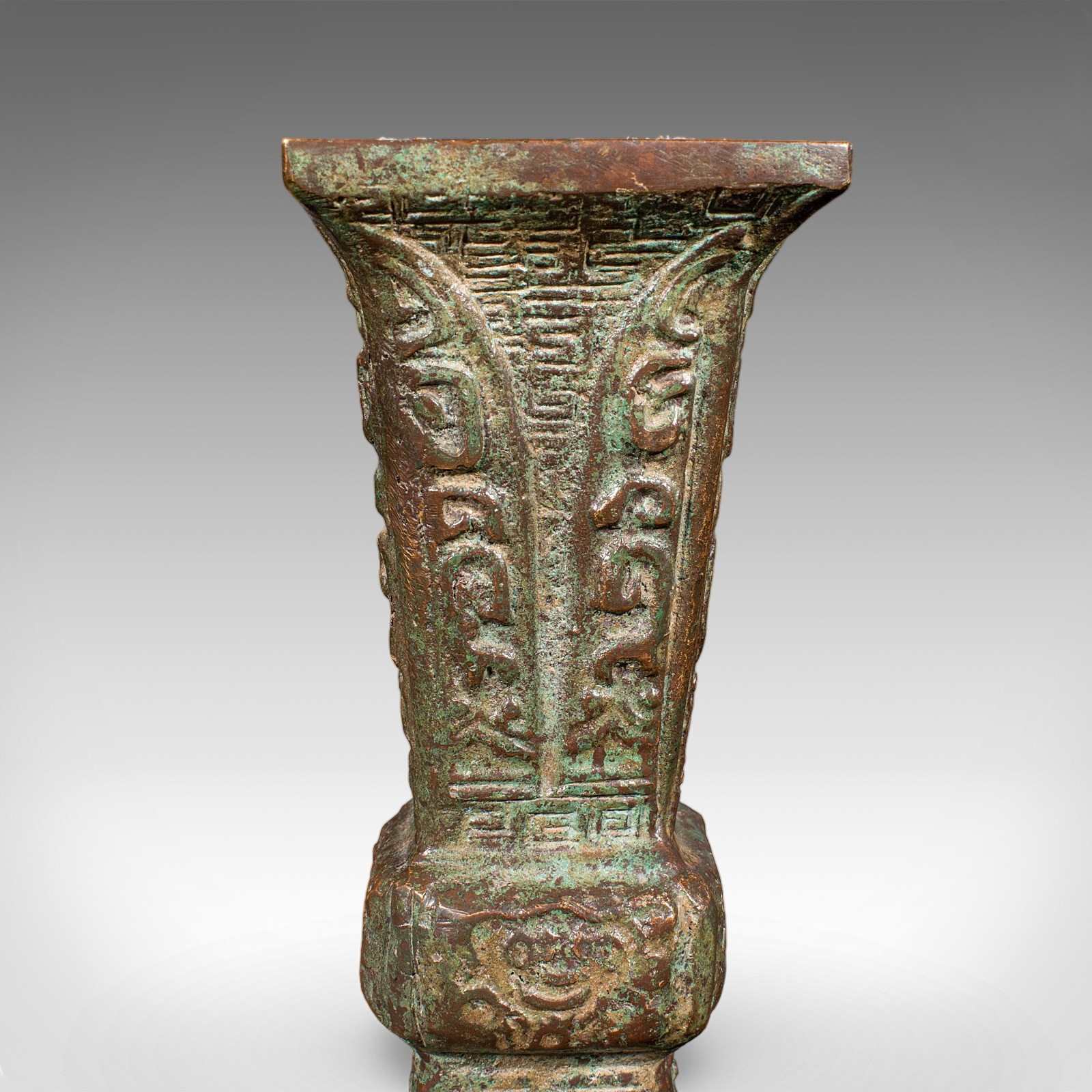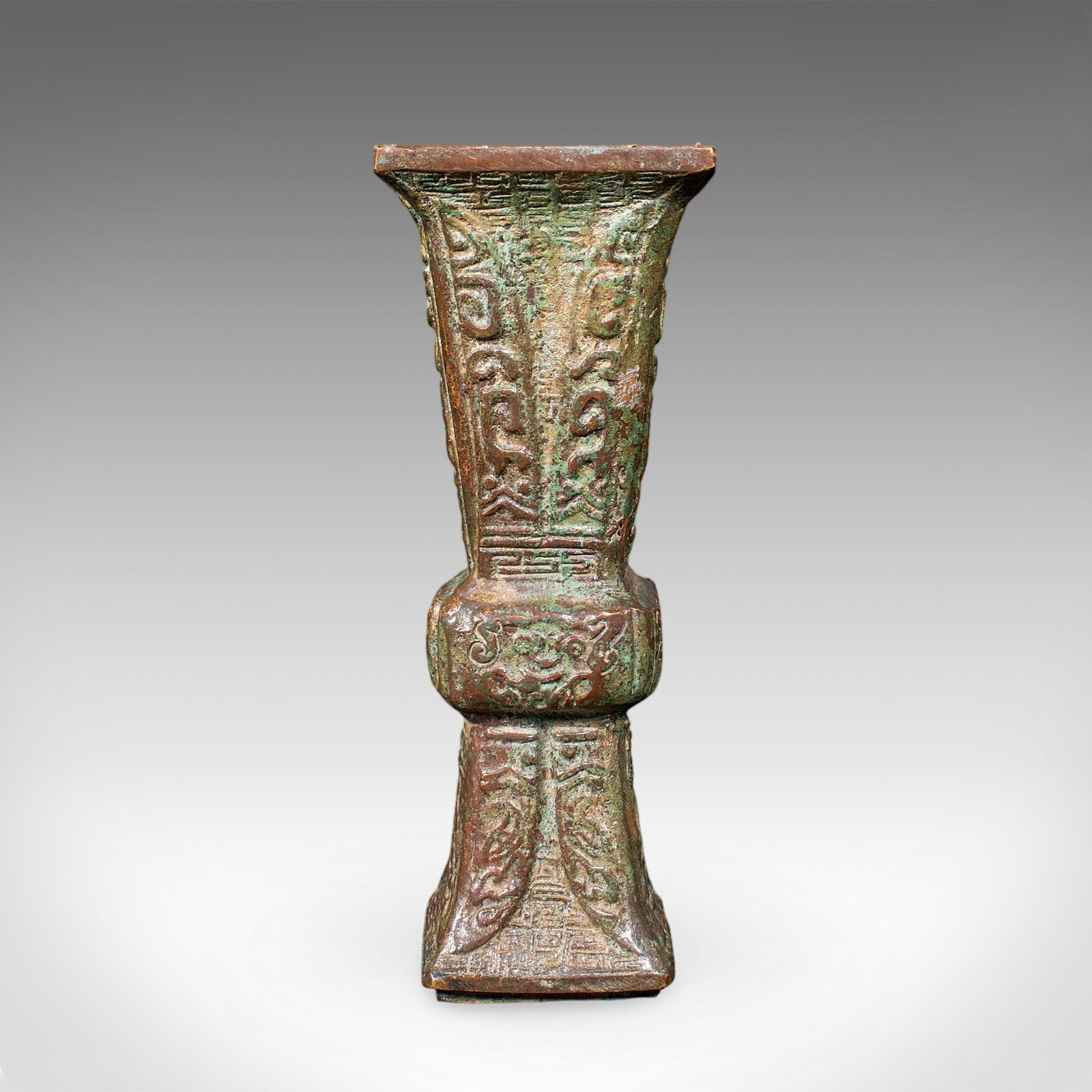 This is an antique Gu ritual vessel. An Oriental, bronze ceremonial beaker, dating to the late Victorian period, circa 1900.
