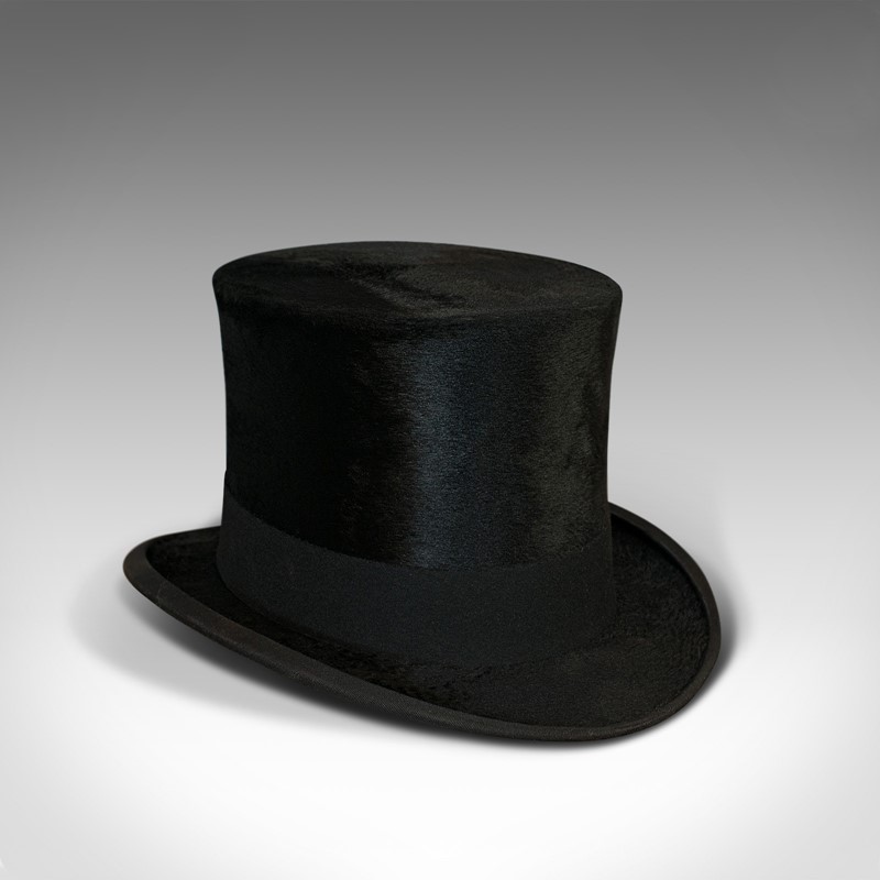 This is an antique hat box. An English, leather hat case with silk top hat by Dunn, dating to the Regency period and later, circa 1820.