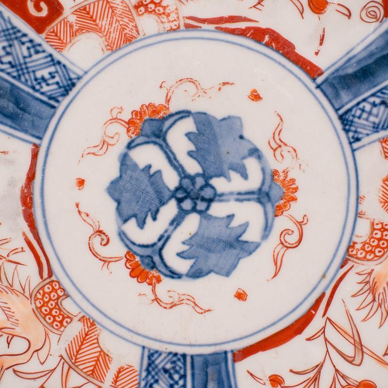 This is an antique Imari display plate. A Japanese hand-painted ceramic serving dish, dating to the late Victorian period, circa 1900.