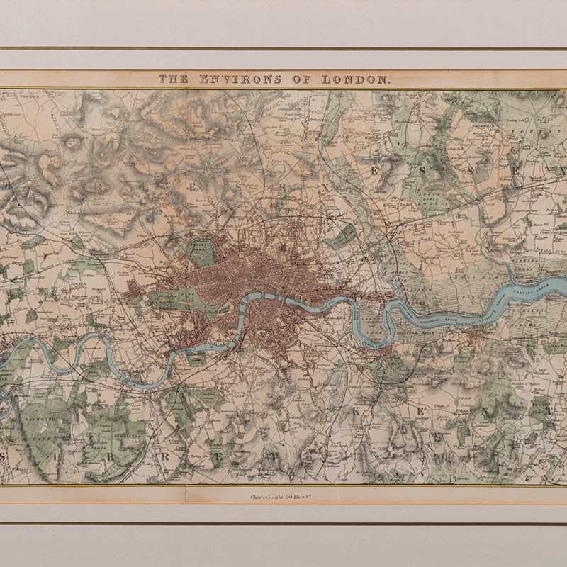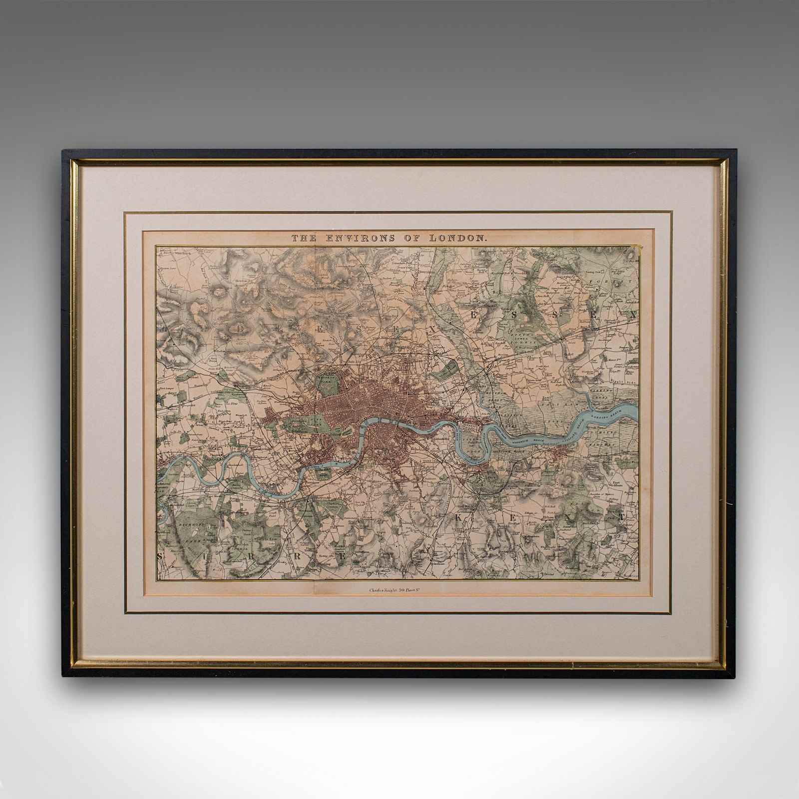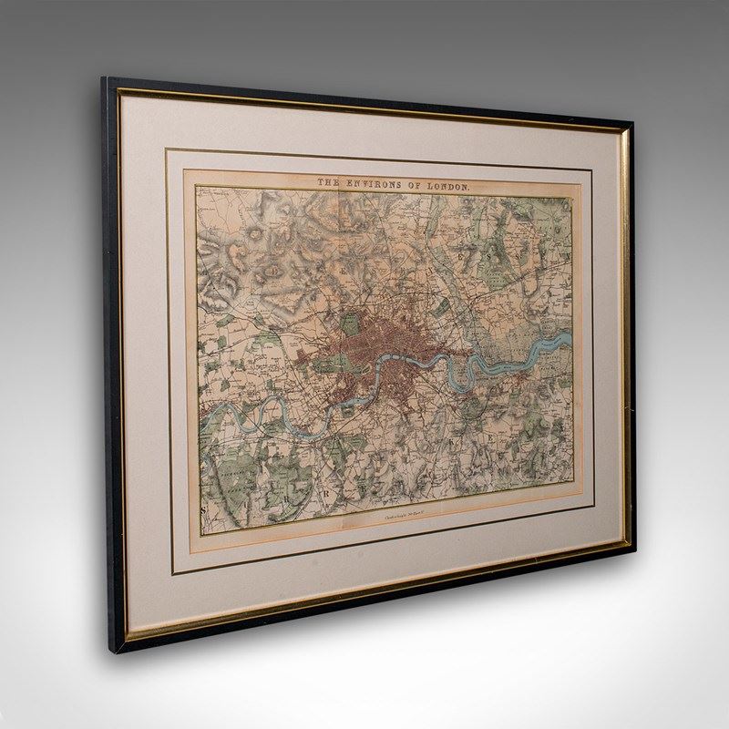 This is an antique map, The Environs of London. An English, framed city map with hand coloured detail, dating to the early Victorian period, circa 1850. A wonderfully presented, hand-coloured map of the City of London and the surrounding boroughs, tastefully mounted within a later frame.