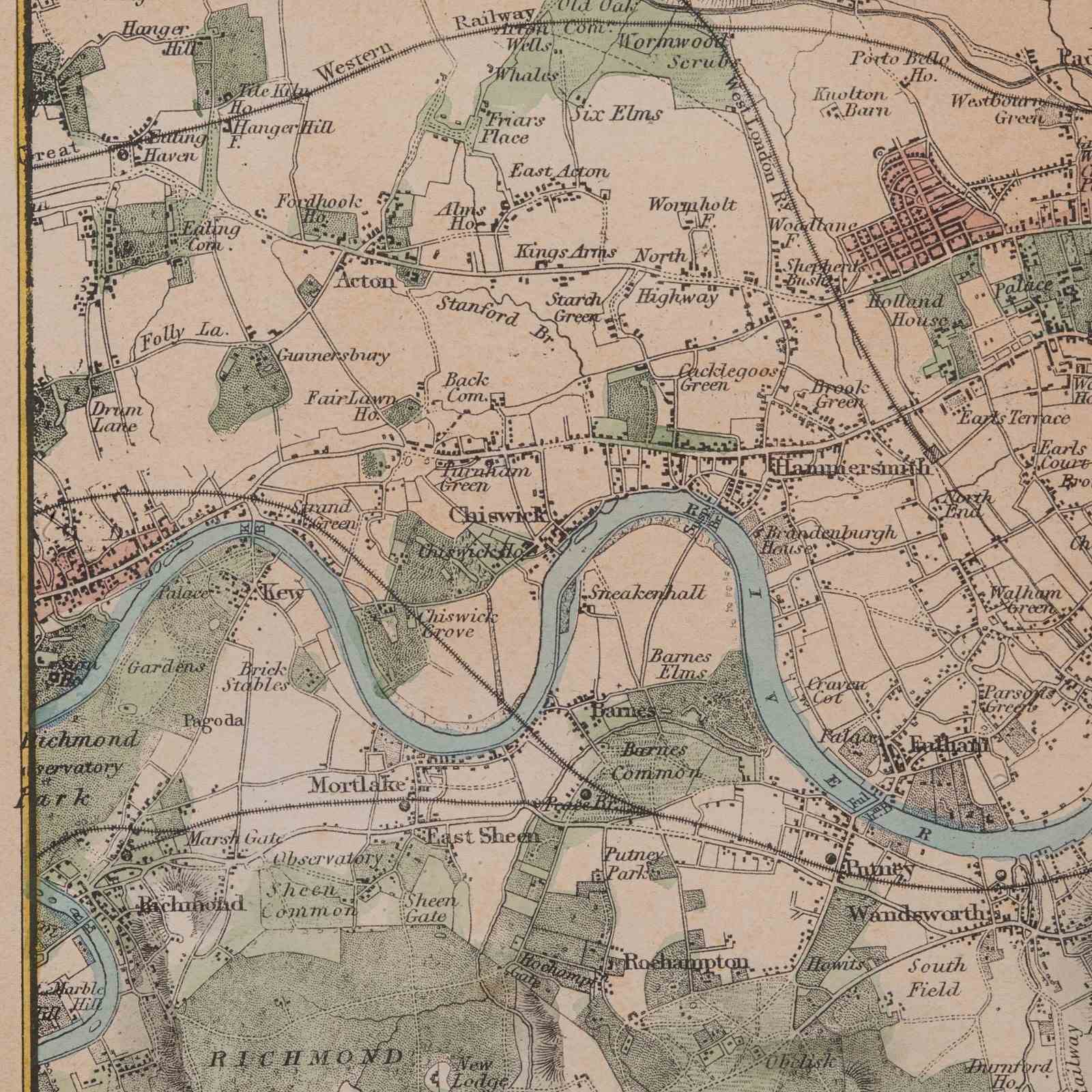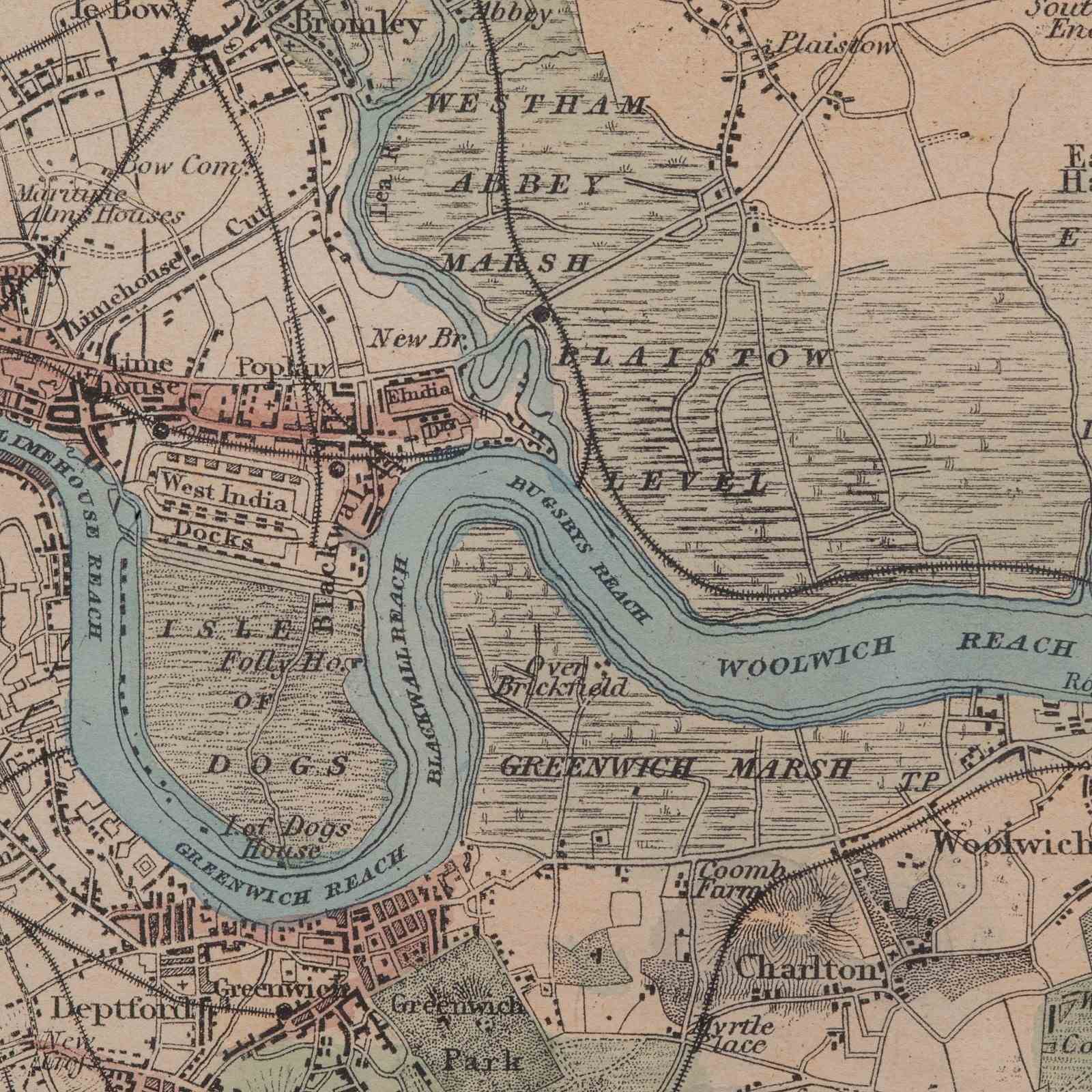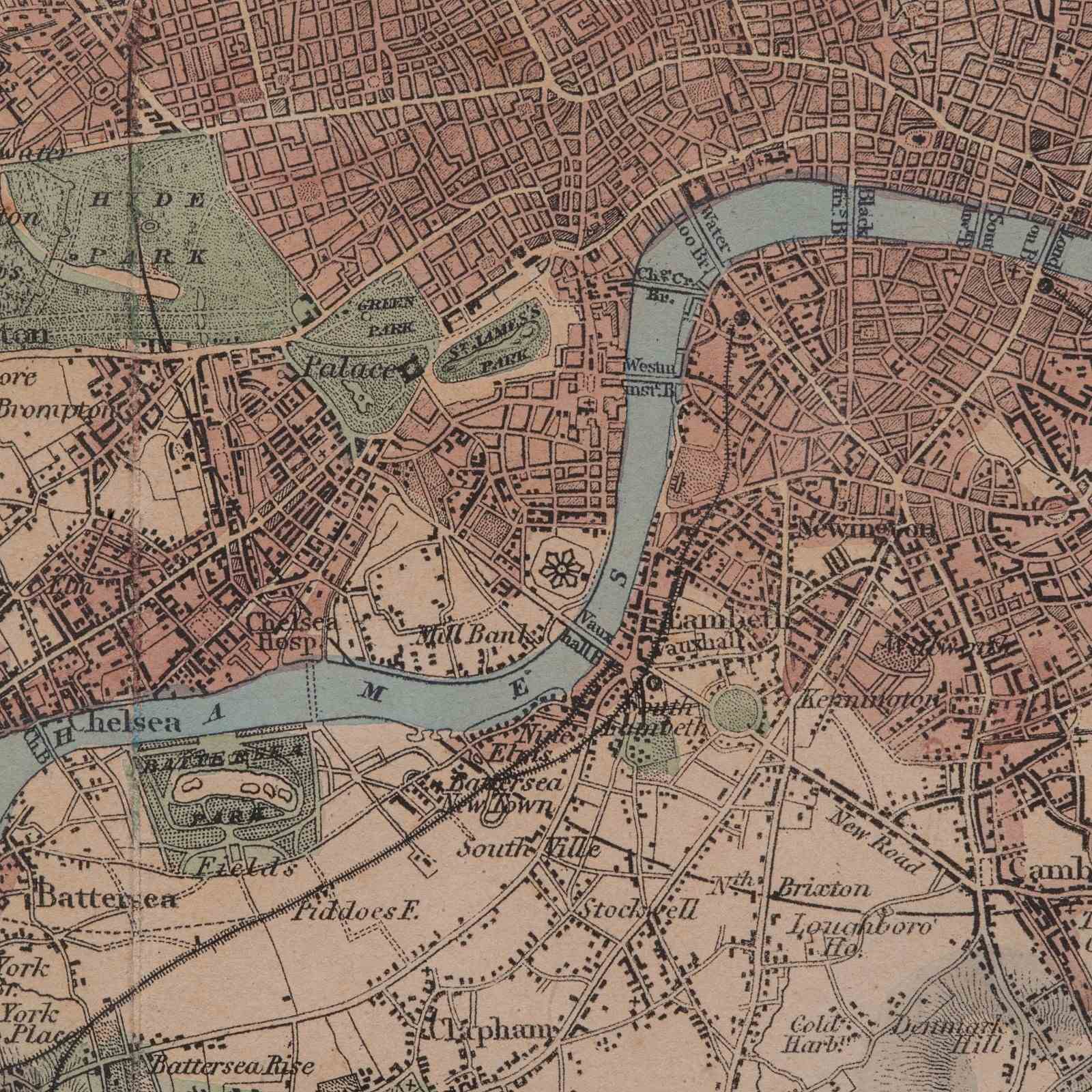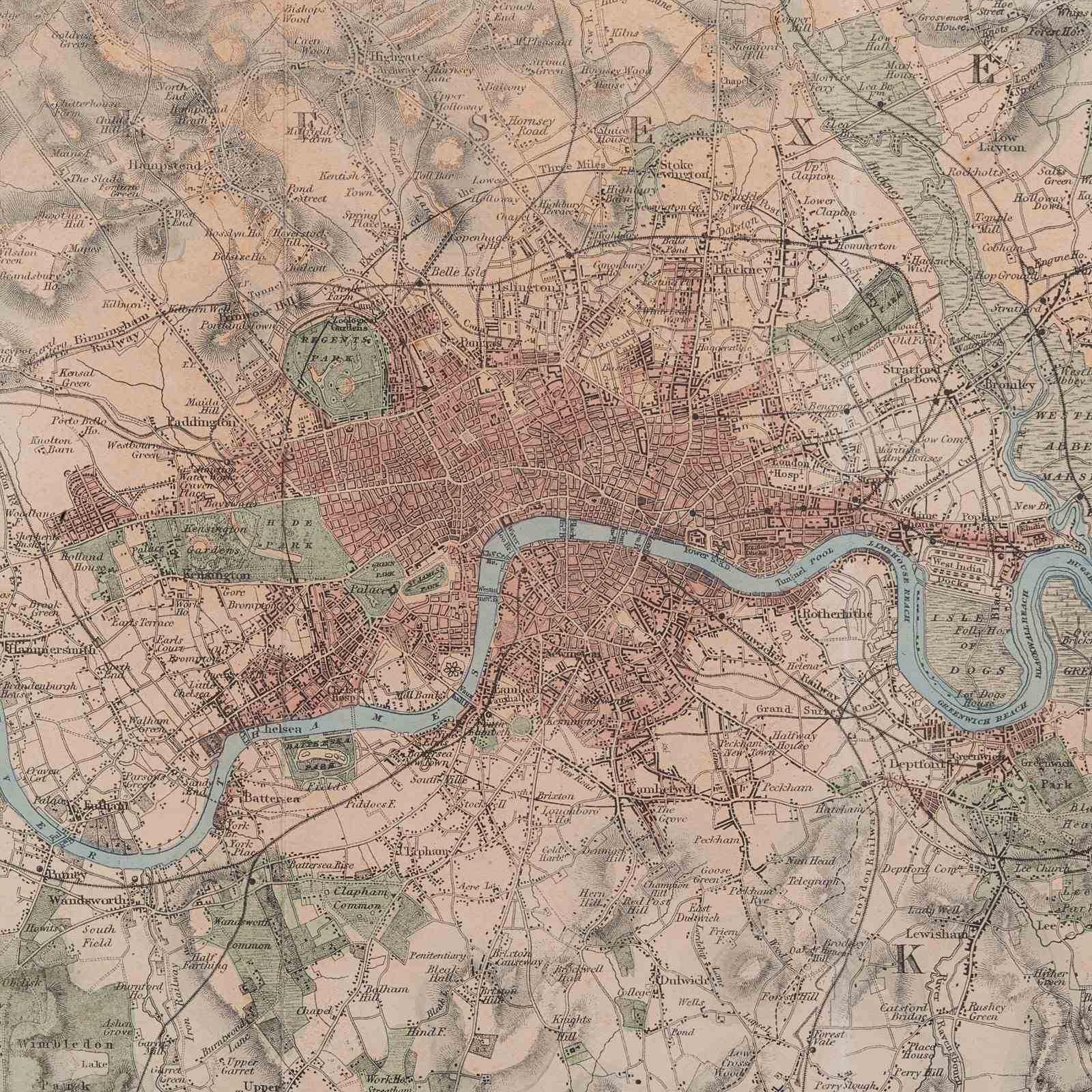 Colour used to key the city in red, parks in green and the Thames in blue