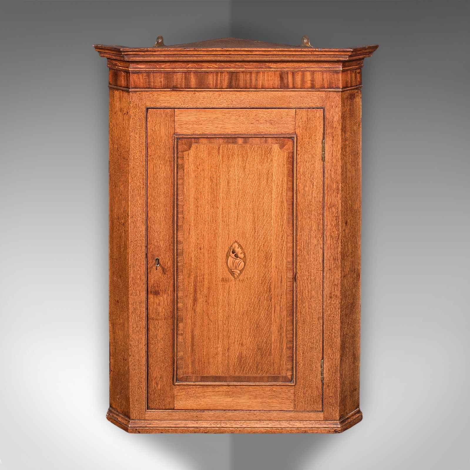 This is an antique mounted corner cabinet. An English, golden oak and mahogany wall cupboard with inlaid shell motif, dating to the Georgian period, circa 1780. A superbly proportioned example, displaying refined craftsmanship and elegant inlaid detail.