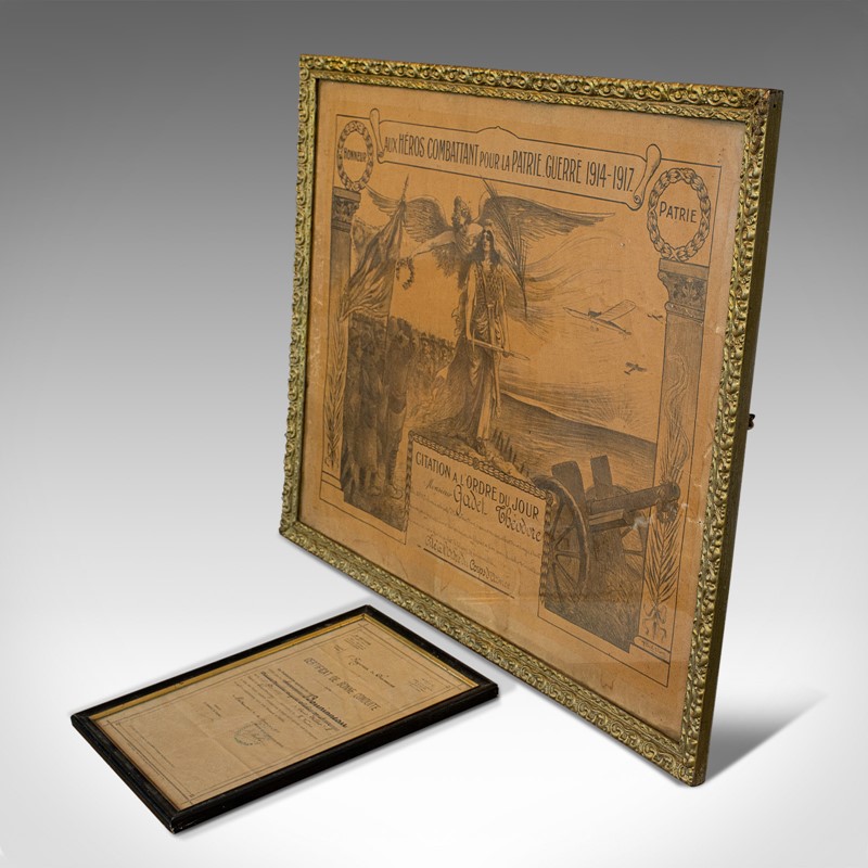 Antique Pair of Framed Certificates, French, Award of Honour, WW1, Circa 1920