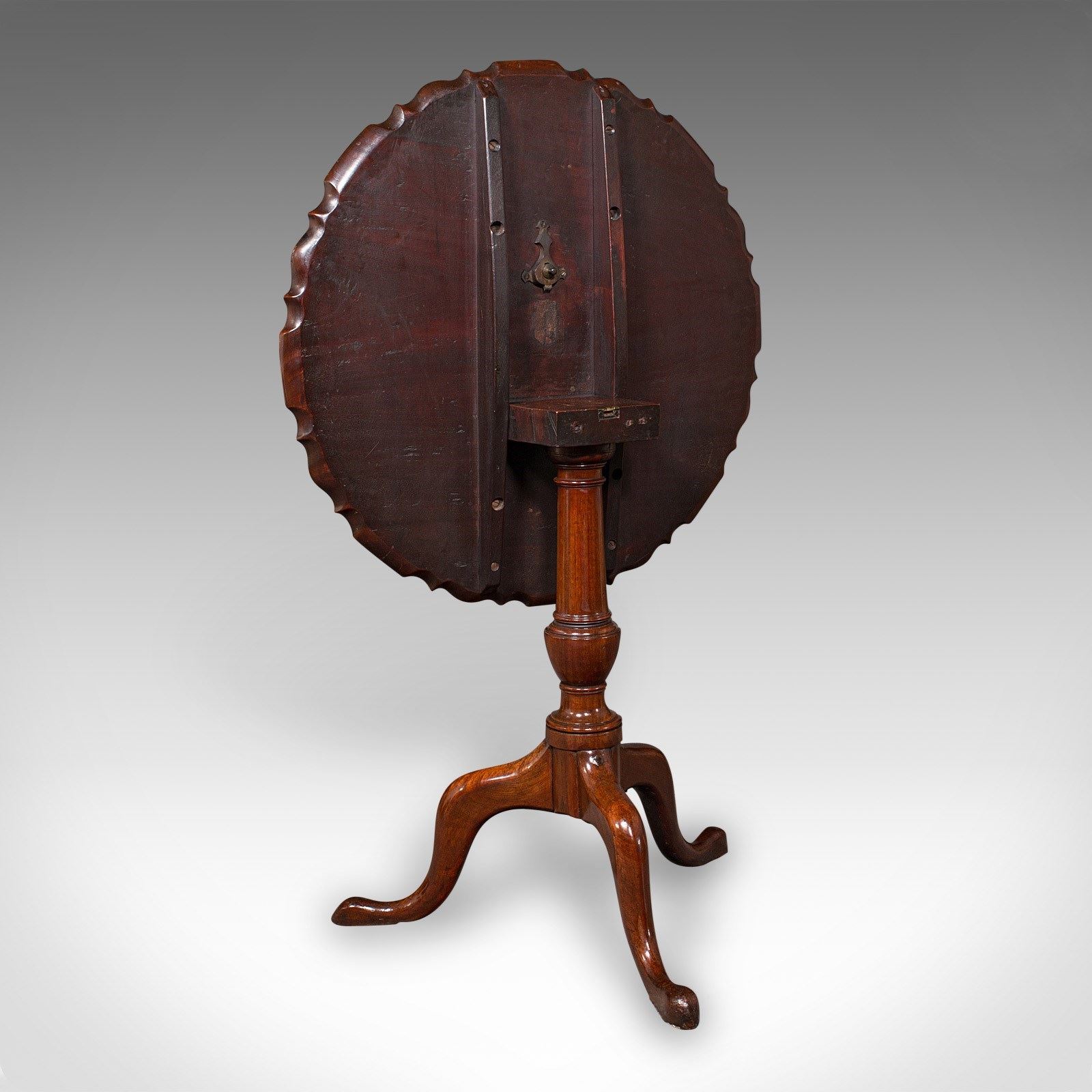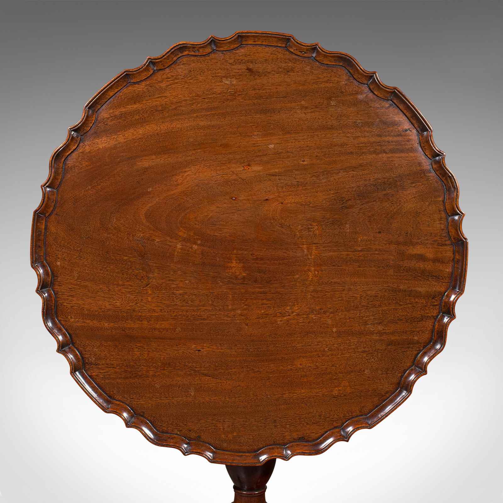 This is an antique pie crust side table. An English, mahogany tilt-top games or occasional table, dating to the Georgian period, circa 1790. A fine example of 18th century craftsmanship, displaying the period-favourite pie crust form and elegant proportions.