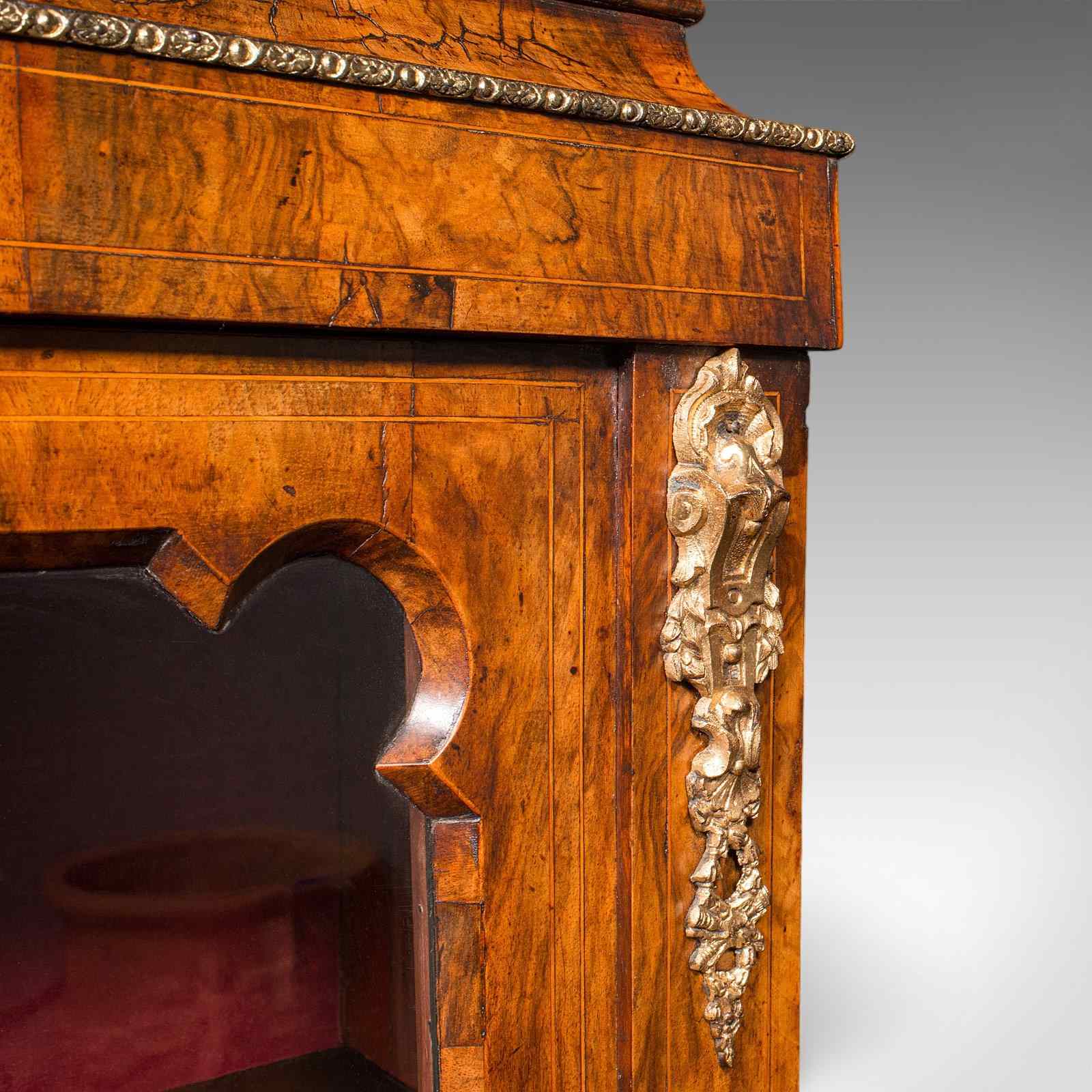 This is an antique pier cabinet. An English, walnut and ormolu glazed display or bookcase, dating to the Victorian period, circa 1860. An exceptional example, notable for its refined craftsmanship and particularly elegant, glazed door.