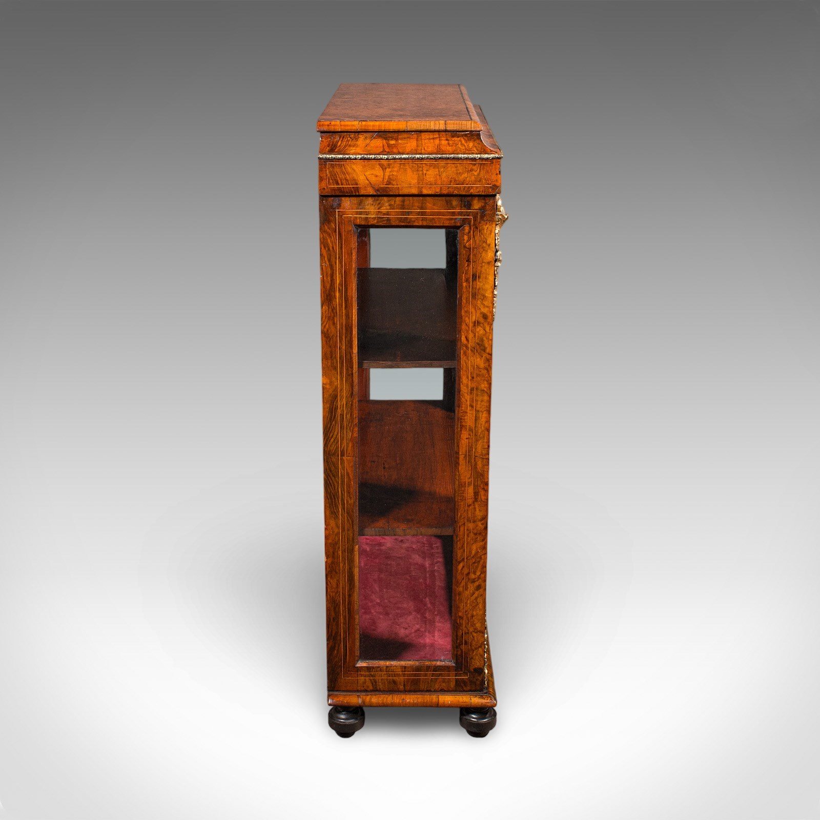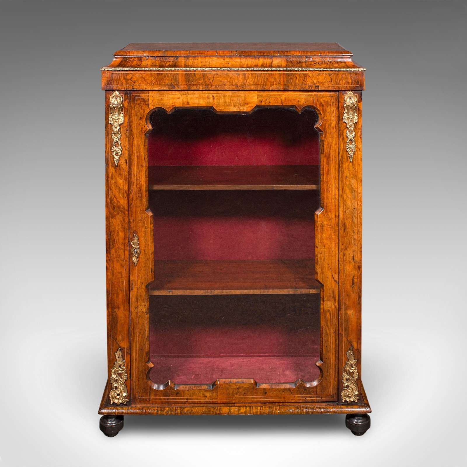 A highly desirable Victorian walnut and ormolu pier cabinet, perfect for showcasing books, ceramics or collectibles within a refined drawing room, hallway or study. Solid joints and construction, delivered ready for the home.