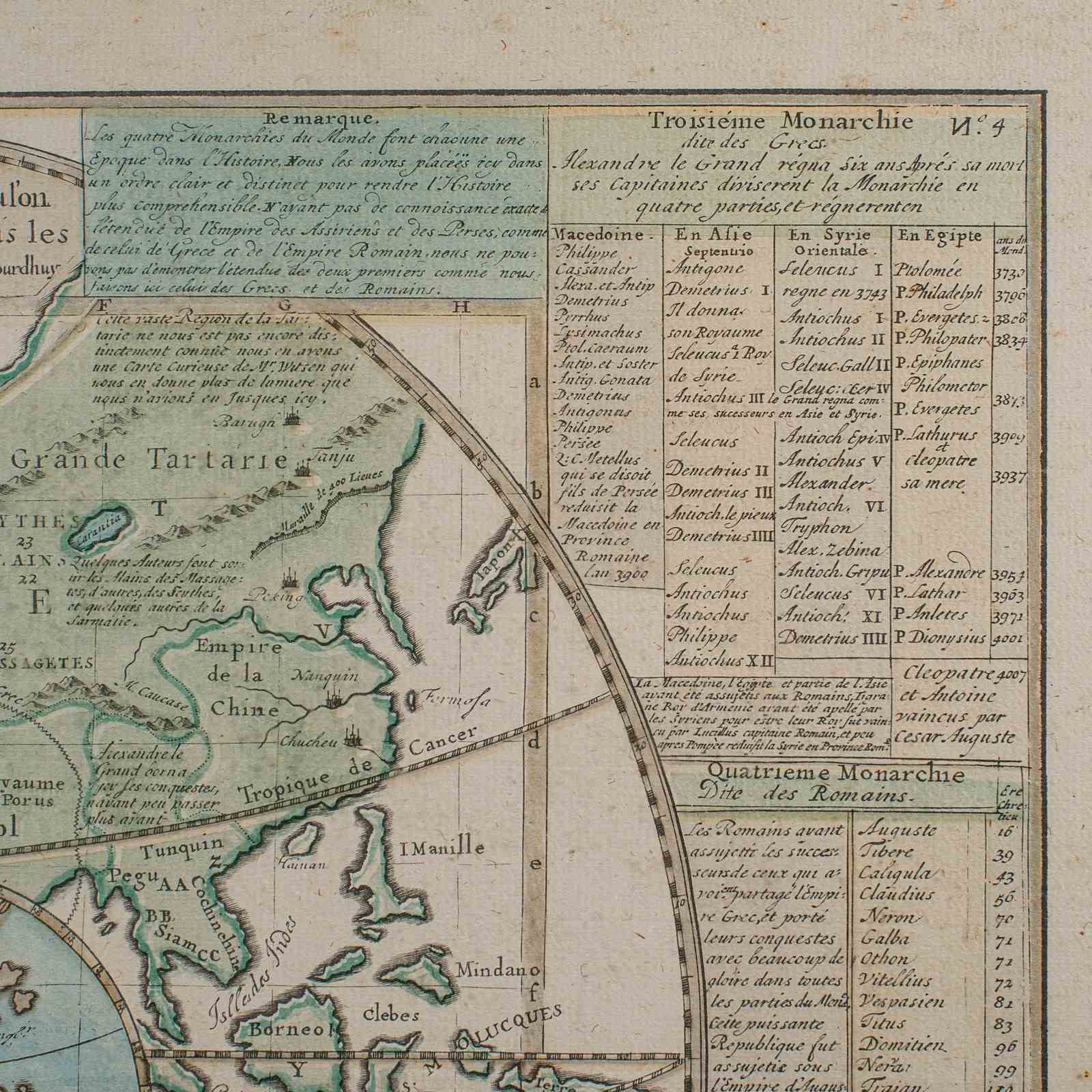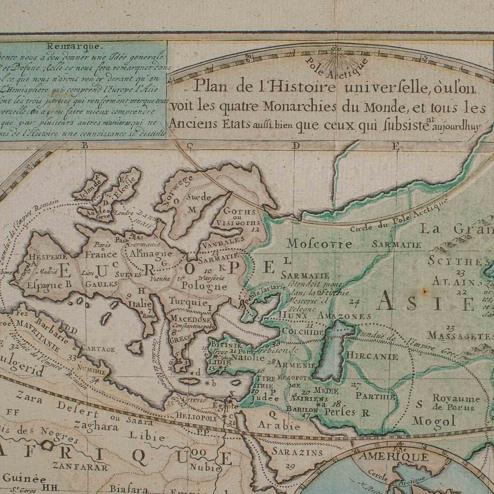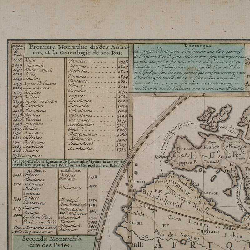 Published in Amsterdam, with all text in French. The full title reads; Plan de l'Historie Universelle, Oulon voit les Quartre Monarchies du Monde, et tous les Anciens Etats auffi bien que ceux qui fubsiste