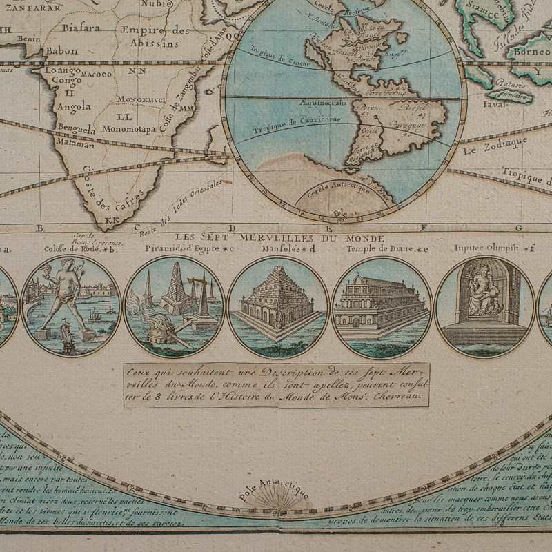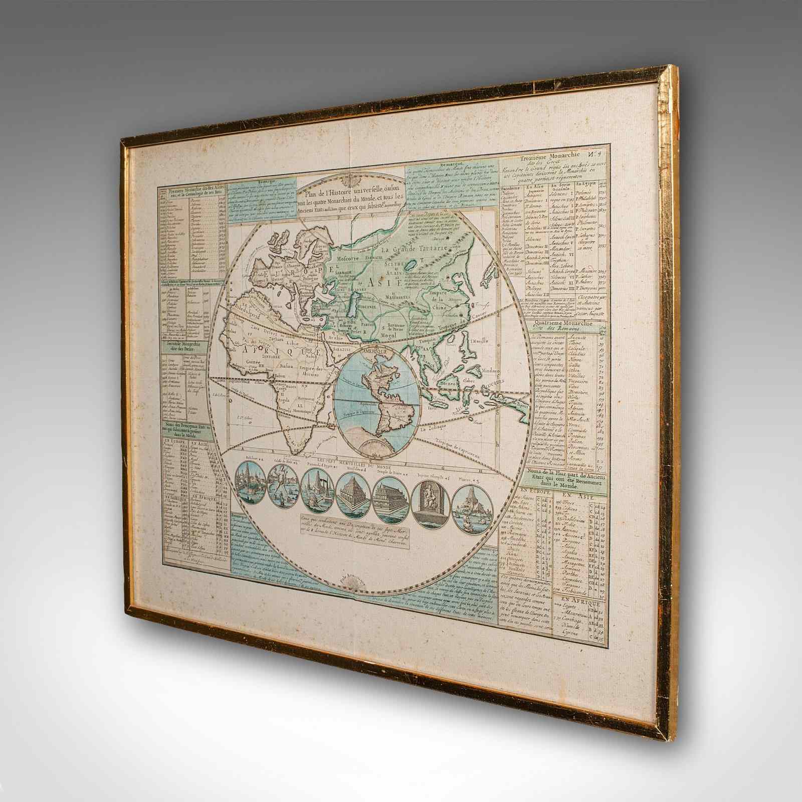 This is a captivating antique Plan de l'Historie Universelle World Map, with fine cartographic interest and fascinating 18th century encyclopaedic detail. A treat for collectors of cartography, historic reference or Francophiles. Delivered ready to display.