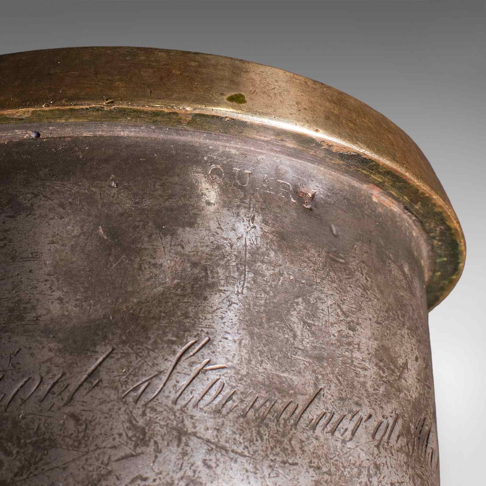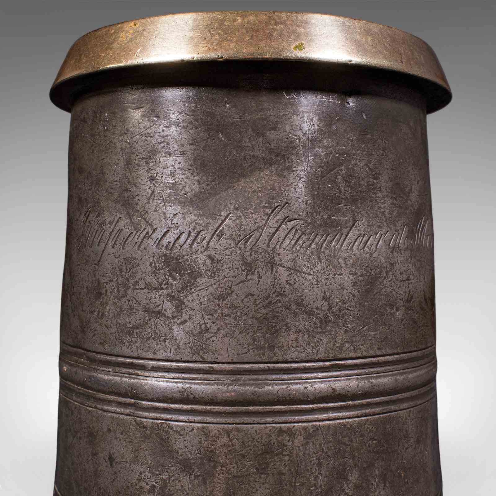 This is an antique public house tankard. An English pewter and brass quart jug, dating to the late Victorian period, circa 1890. A characterful and authentic example, rich in social history and traditional pub measure detail.