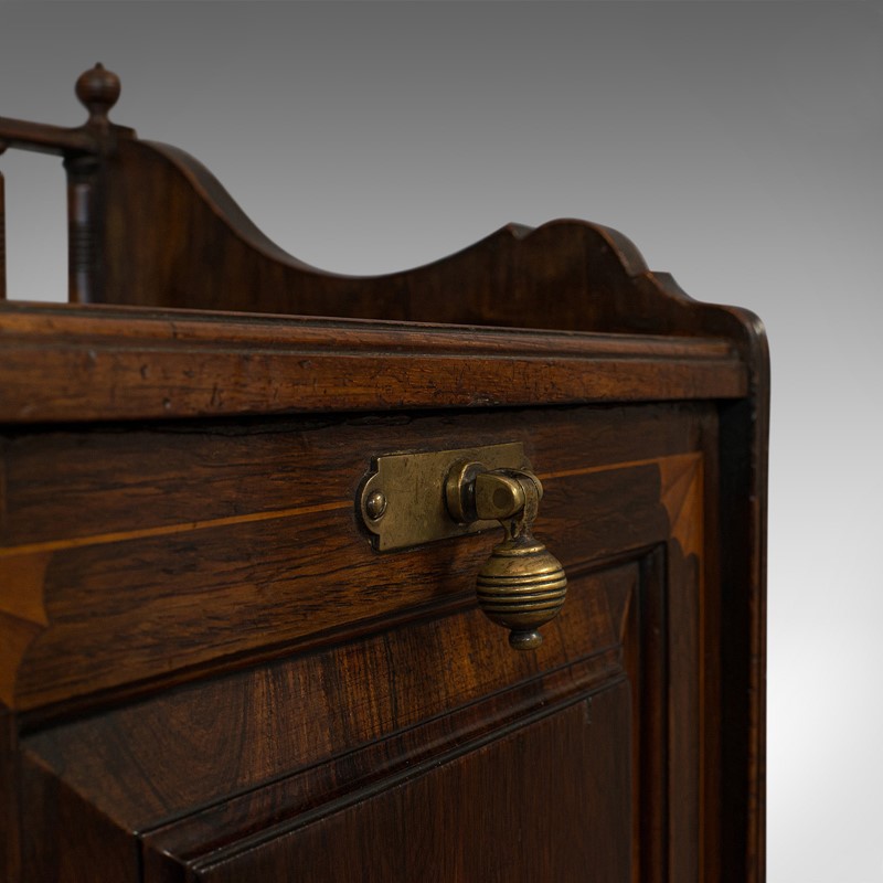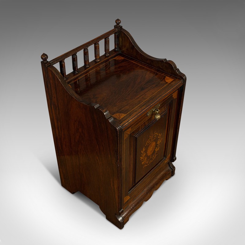 This is an antique purdonium. An English, rosewood fireside cabinet, dating to the Edwardian period, circa 1910.