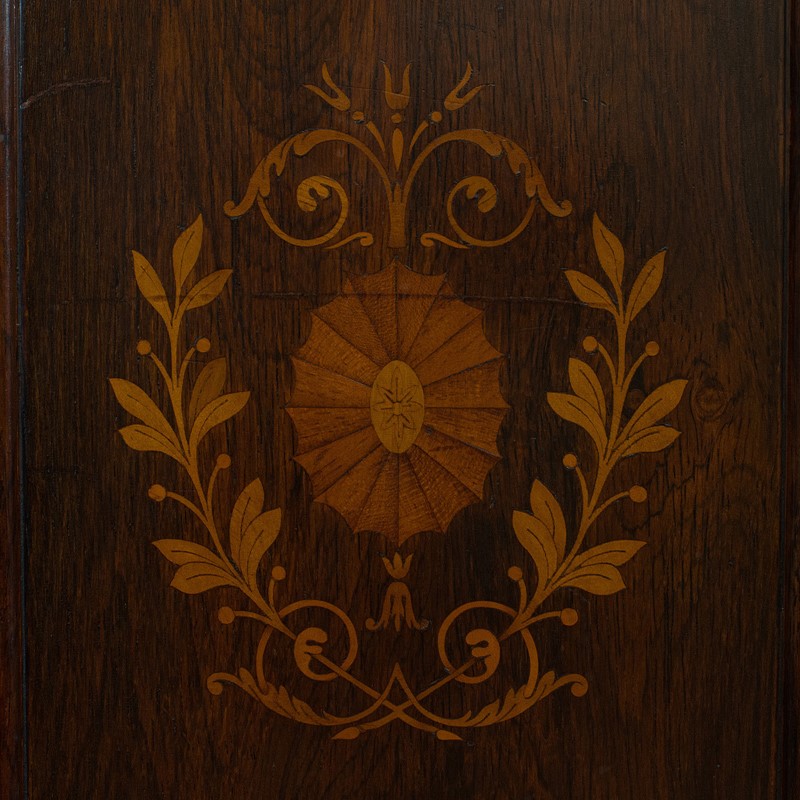 Exquisite marquetry with shell patera surrounded by leaf and foliate forms