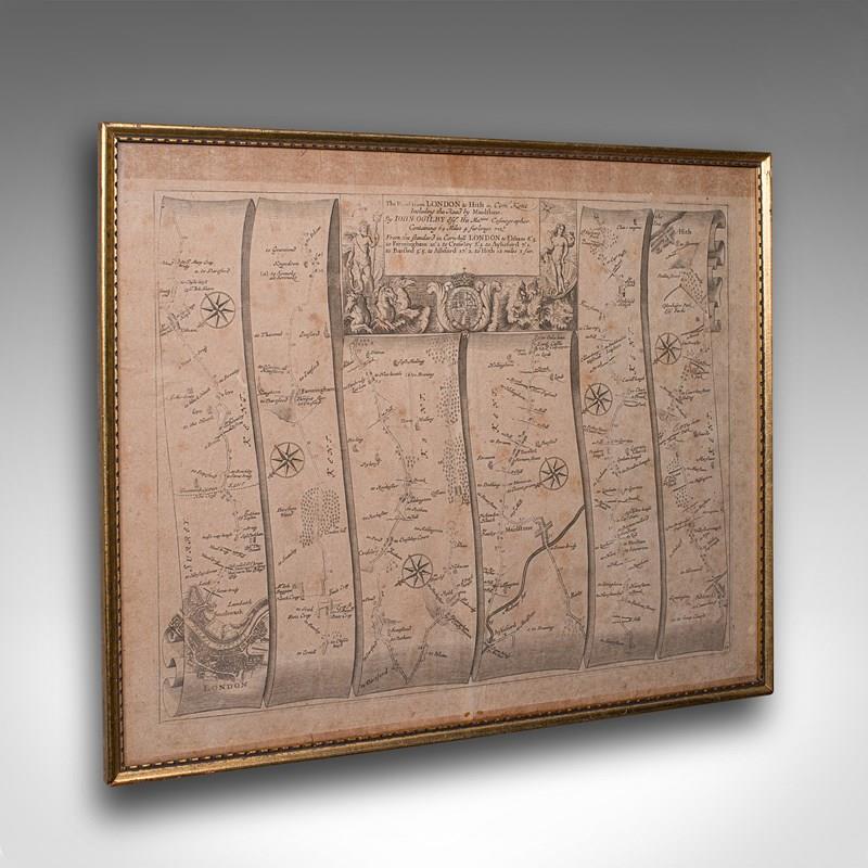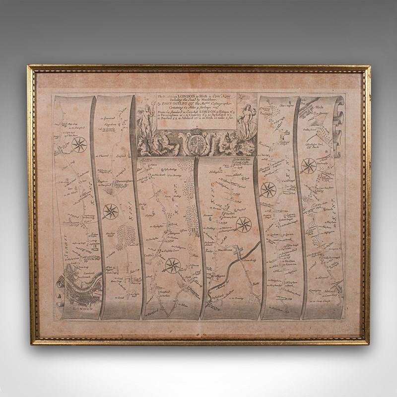 This is an antique Road Map from London to Hythe, Kent. An English, cartographic atlas excerpt by John Ogilby, dating to the late 17th century with later frame, circa 1675
