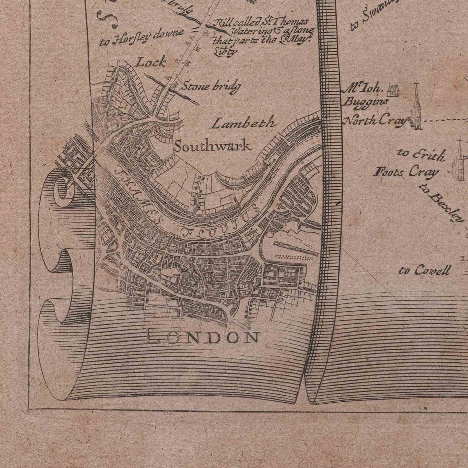 A superb example of early English road cartography, this antique atlas excerpt by John Ogilby depicts the historic route from London to Hythe, Kent. Beautifully preserved and presented within a later glazed frame, this piece embodies the craftsmanship and innovation of Britain’s first road atlas annotated in miles.