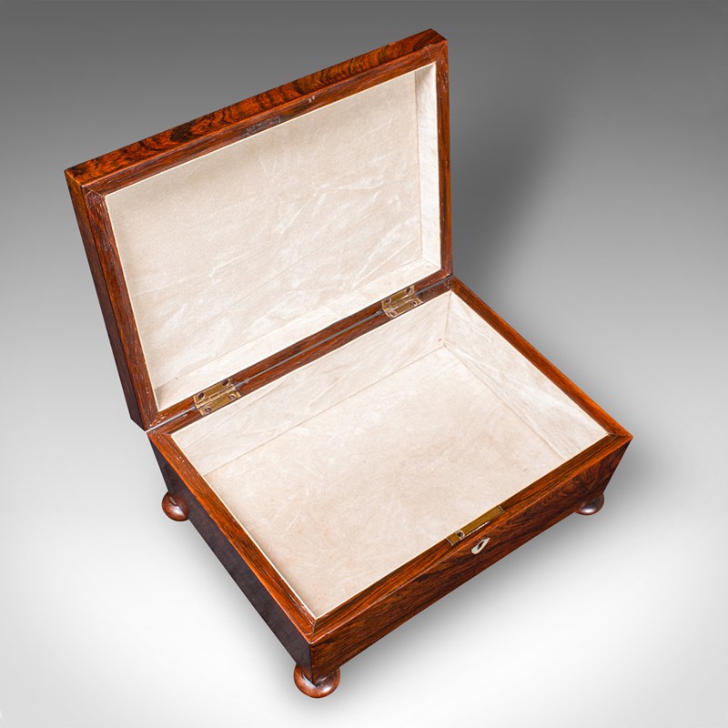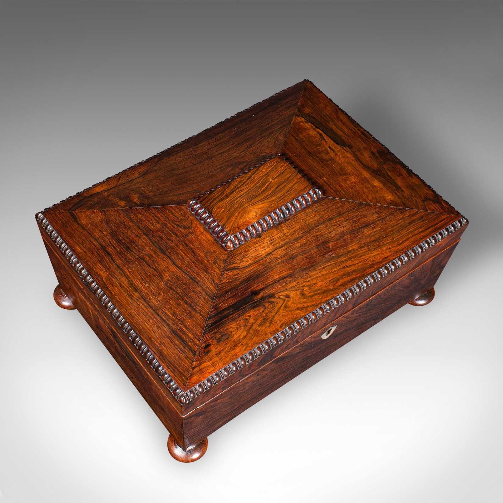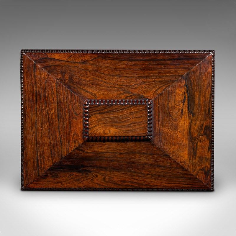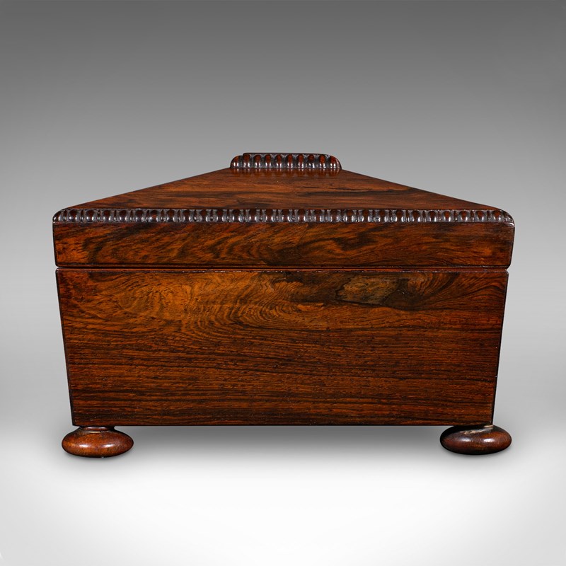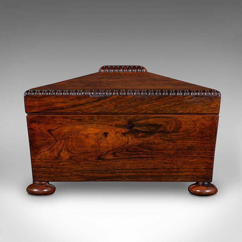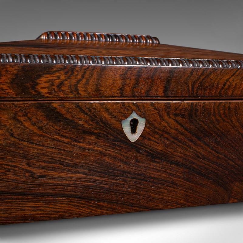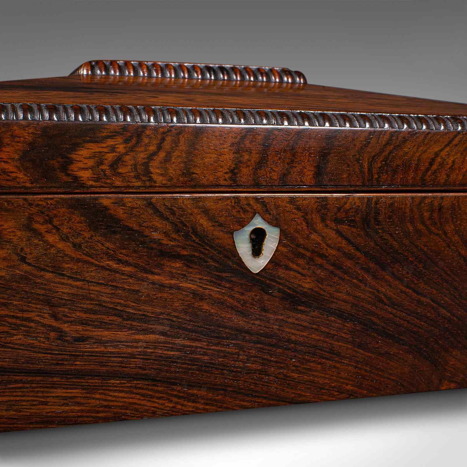 This is an antique sarcophagus keepsake box. An English, rosewood and velvet lined case, dating to the late Regency period, circa 1830.