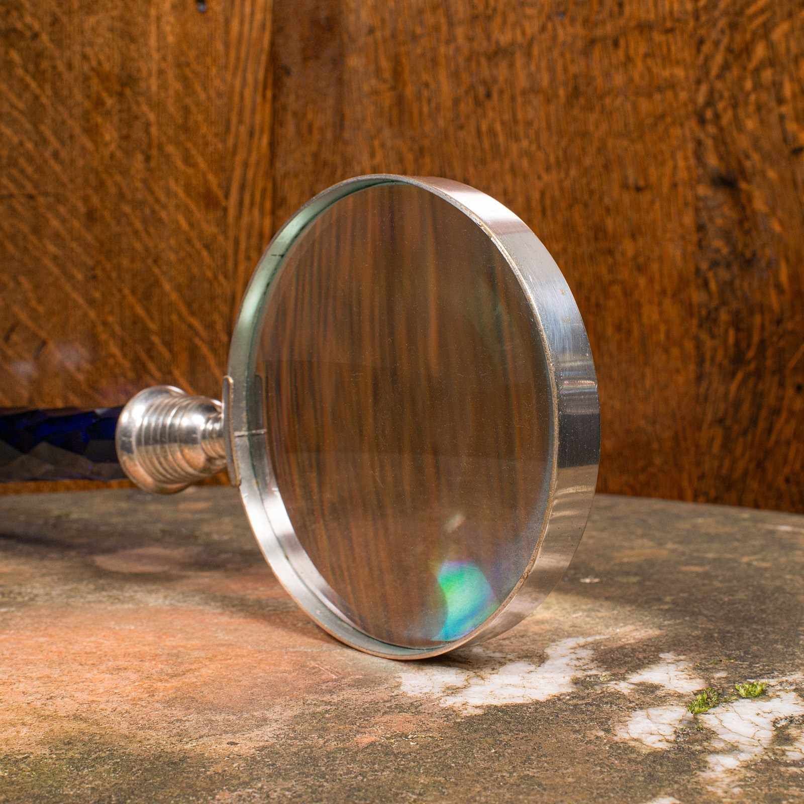 This is an antique scholar's magnifying glass. A French, silver plated needlework or reading magnifier, dating to the Edwardian period, circa 1910.
