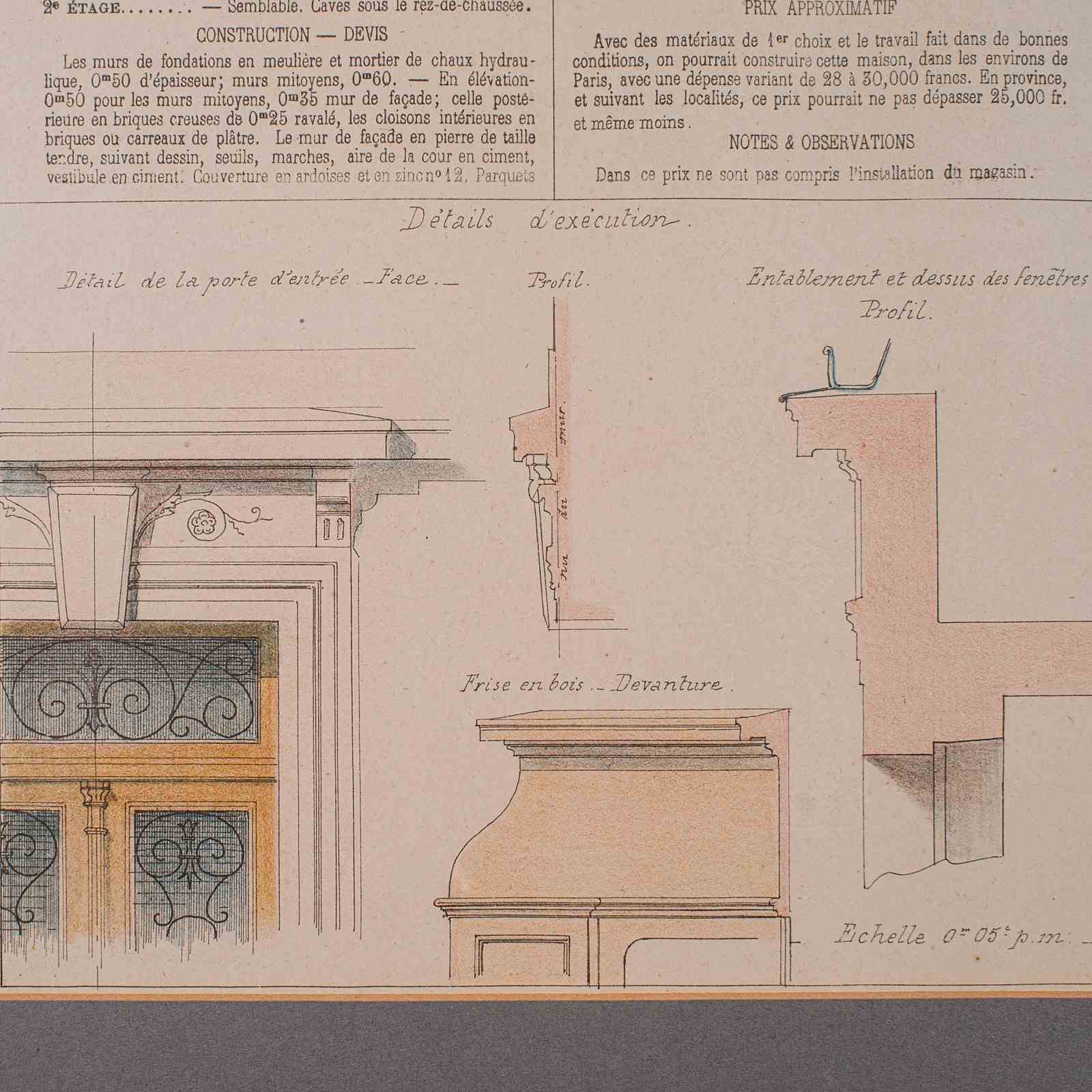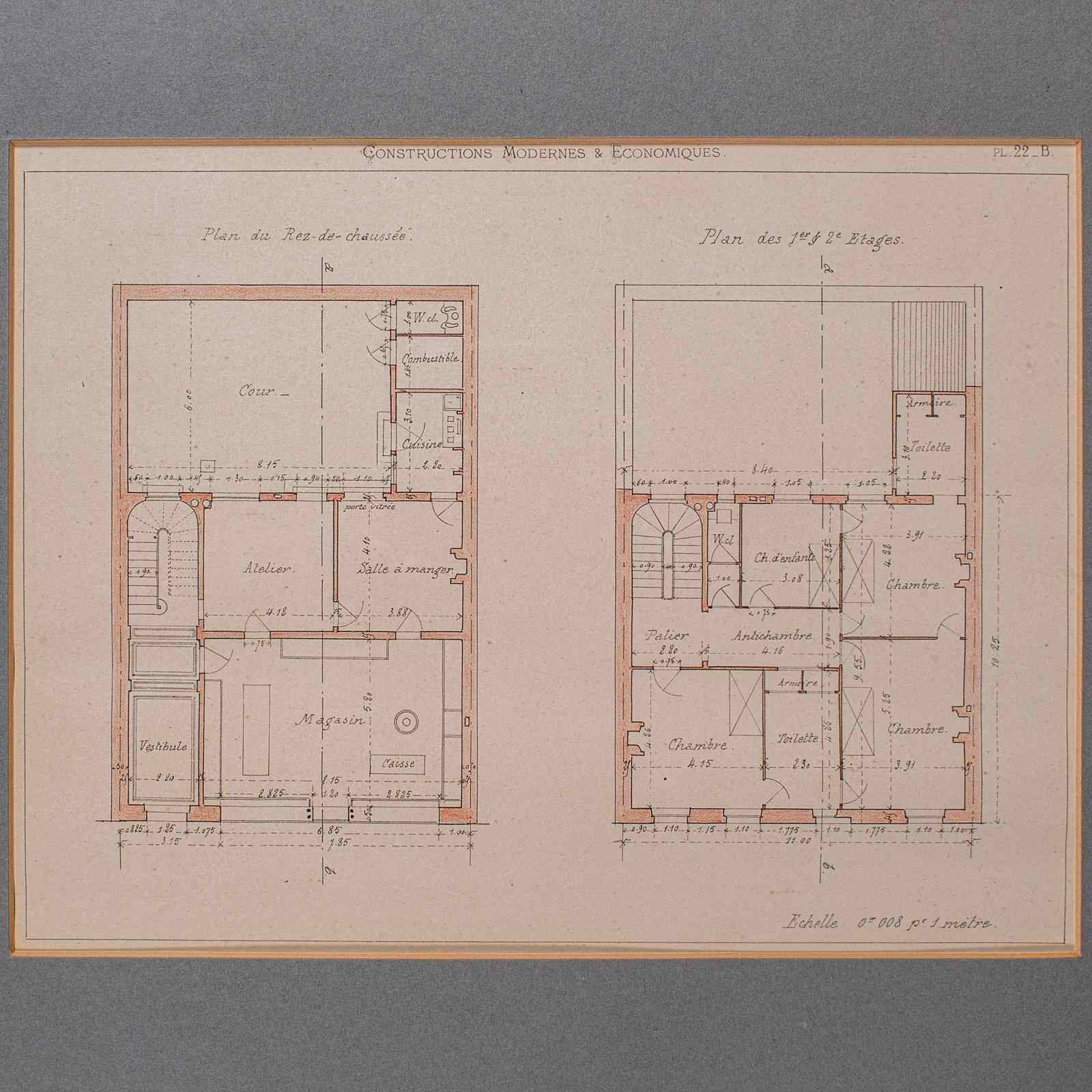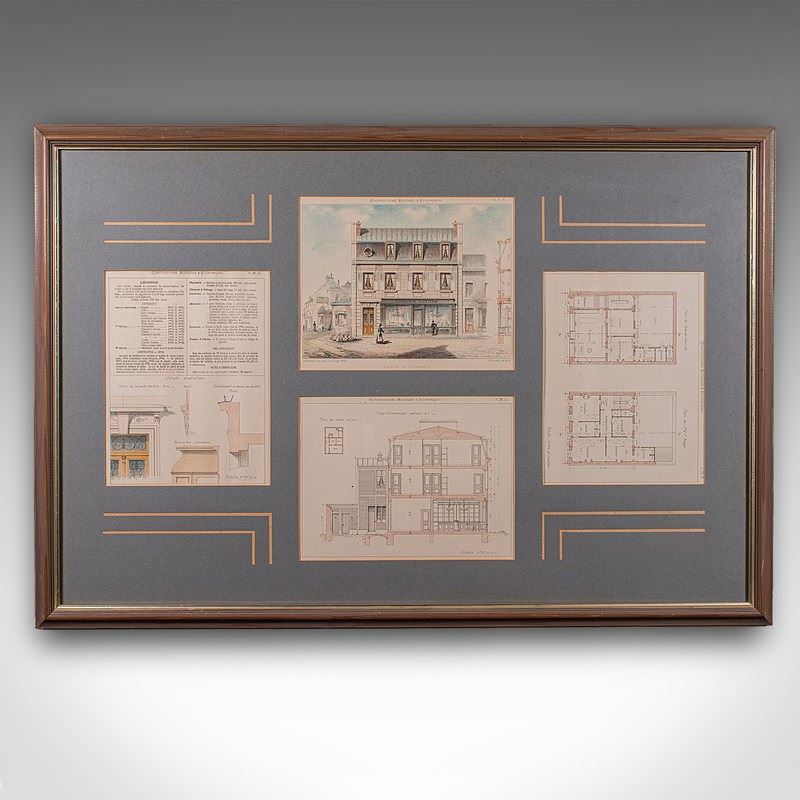 This is an antique framed set of architectural plans. A French, lithograph display of drawings from Constructions Modernes et Economiques, dating to the late Victorian period, circa 1900.