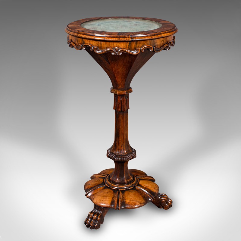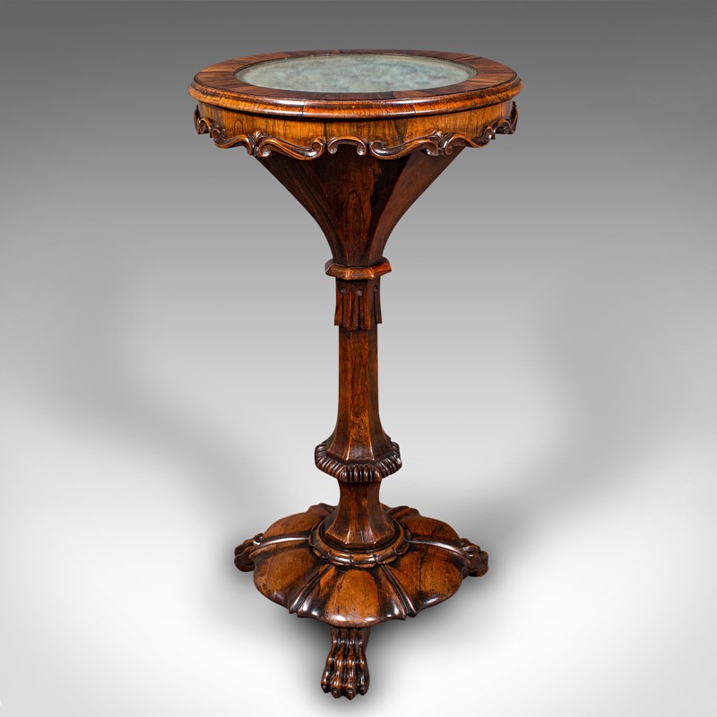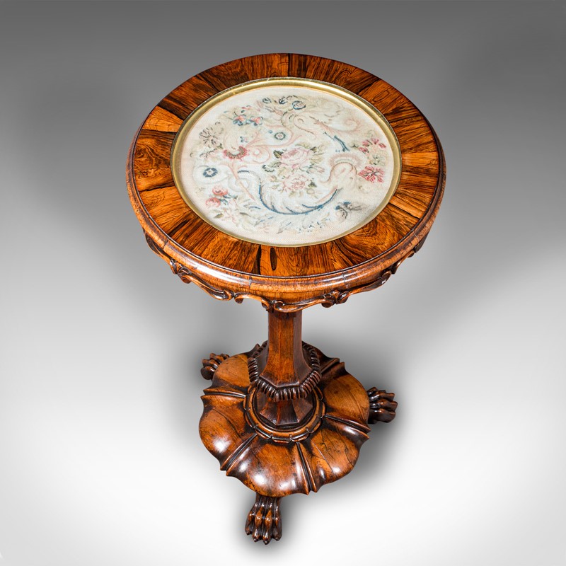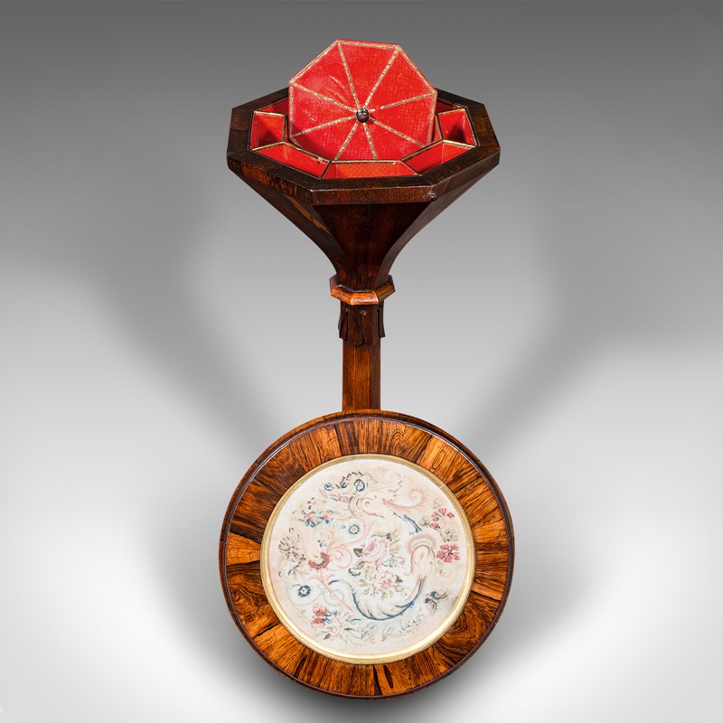 This is an antique sewing table. An English, rosewood and needlepoint tapestry crafting stand, dating to the William IV period, circa 1835.