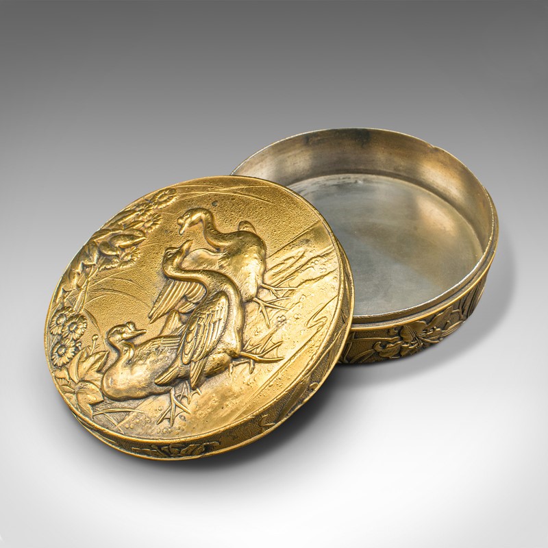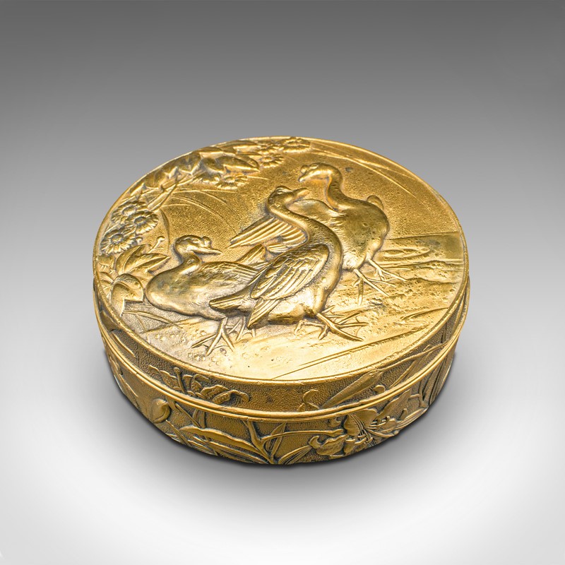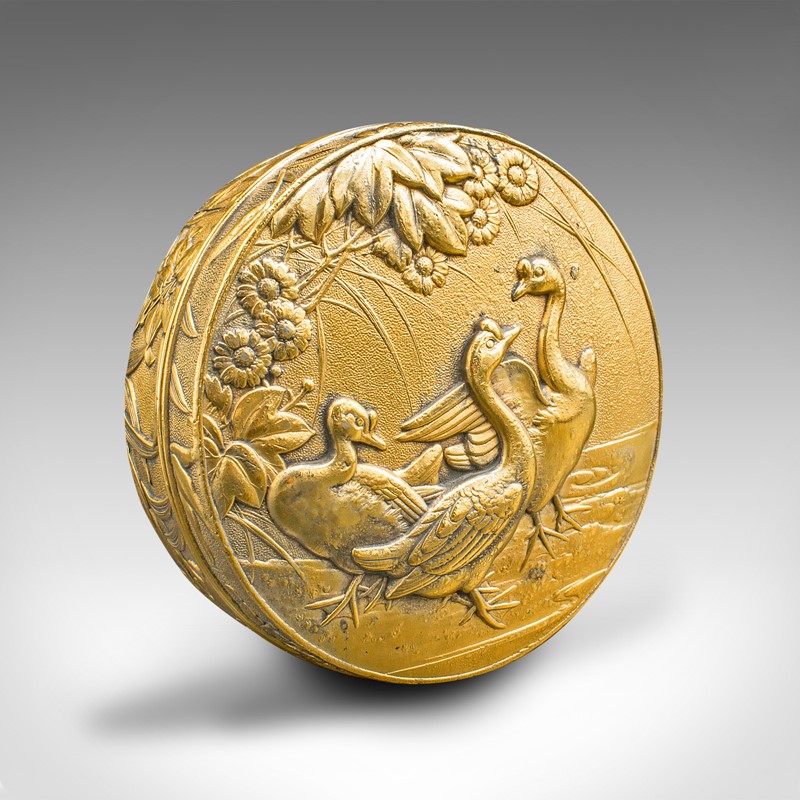 Antique Snuff Tin, English Gilt Metal, Lidded Box, Relief Decor, Victorian, 1880