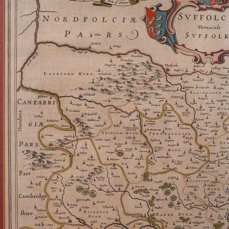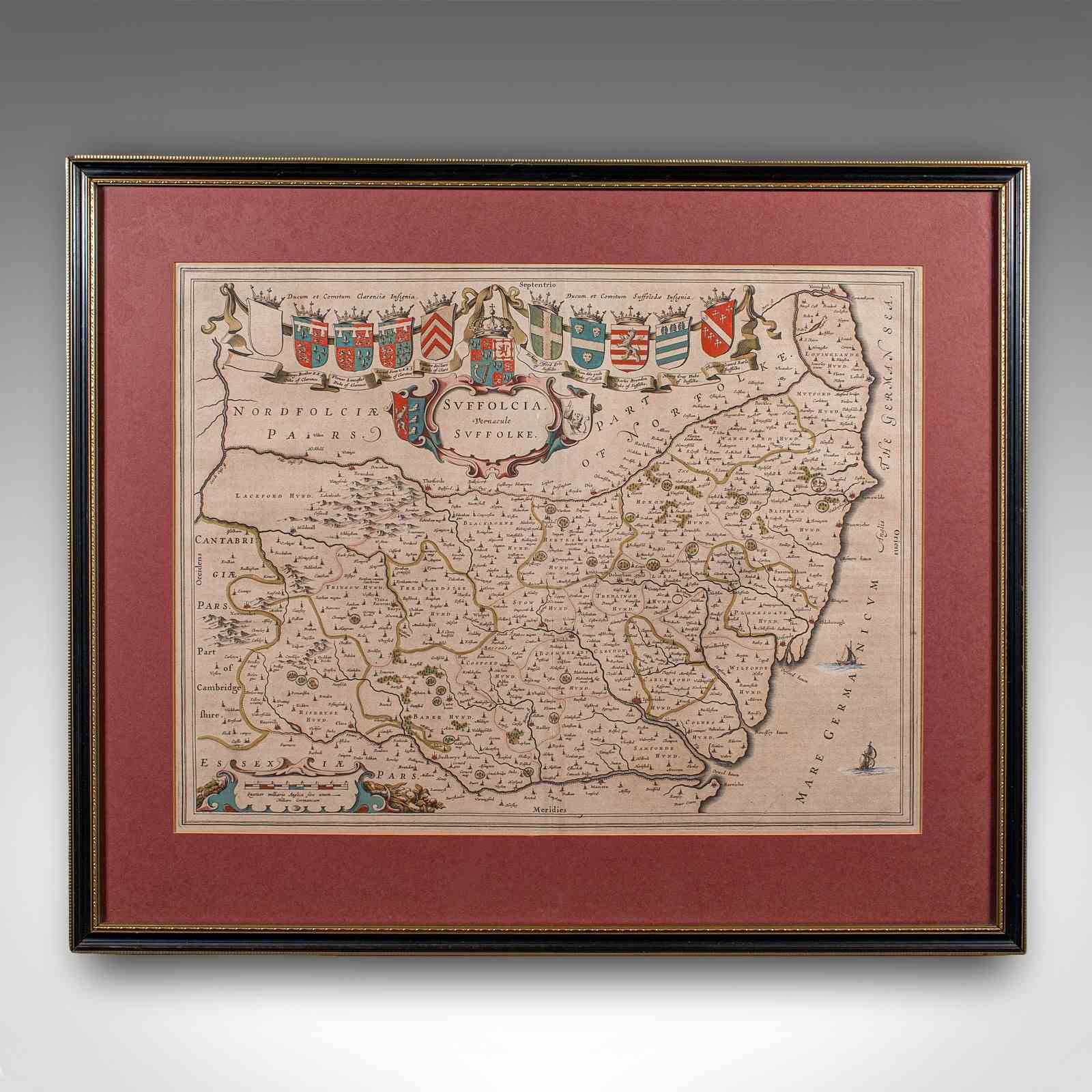 This is an antique county map of Suffolk. A Dutch, framed atlas engraving by Joan Blaeu, dating to the 17th century and later.