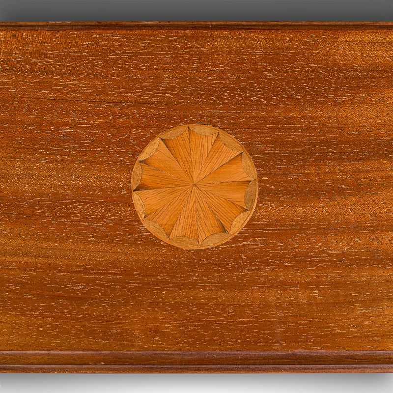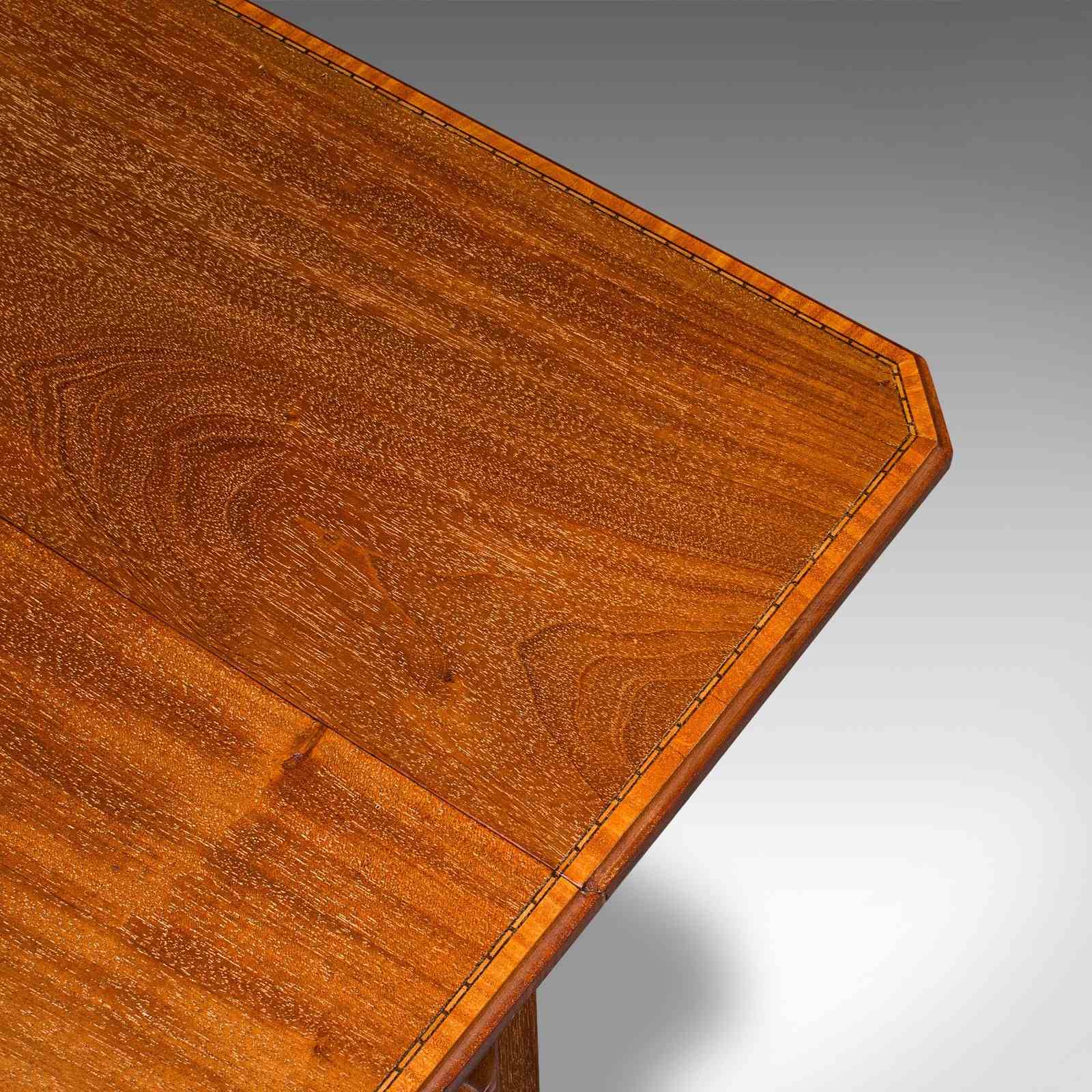 This is an antique Sutherland table. An English, mahogany and boxwood occasional gate leg display table, dating to the late Victorian period, circa 1900.