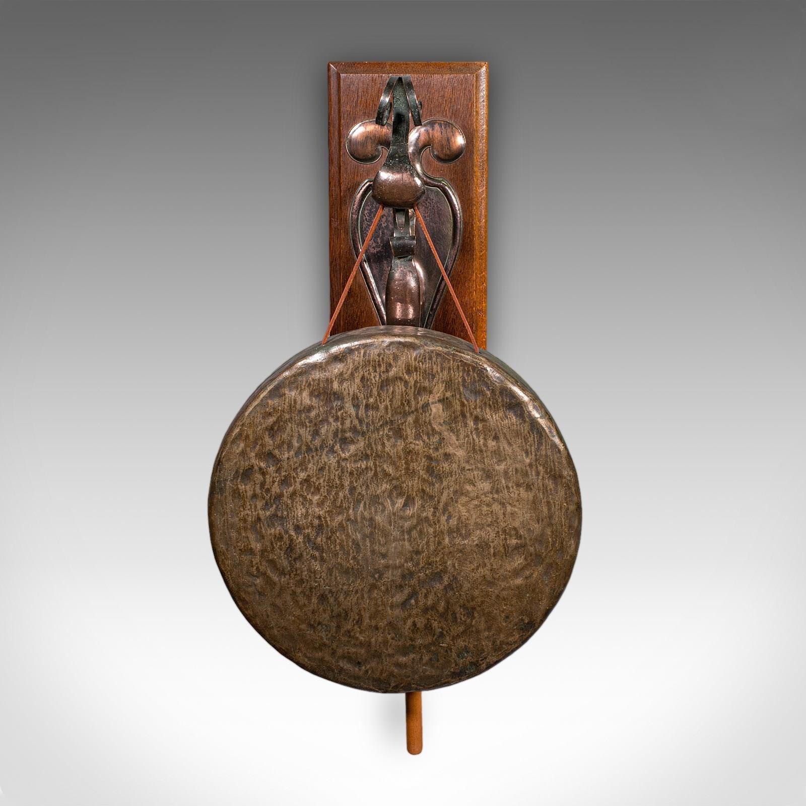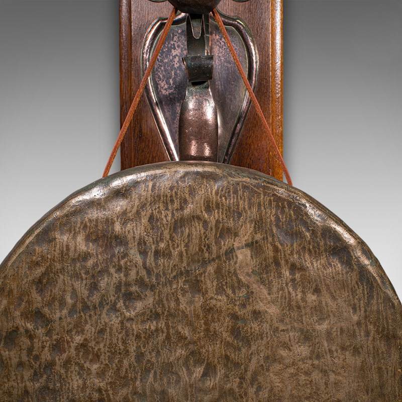 Antique Wall Gong, English, Oak, Bronze, Dinner Chime, Art Nouveau, Victorian