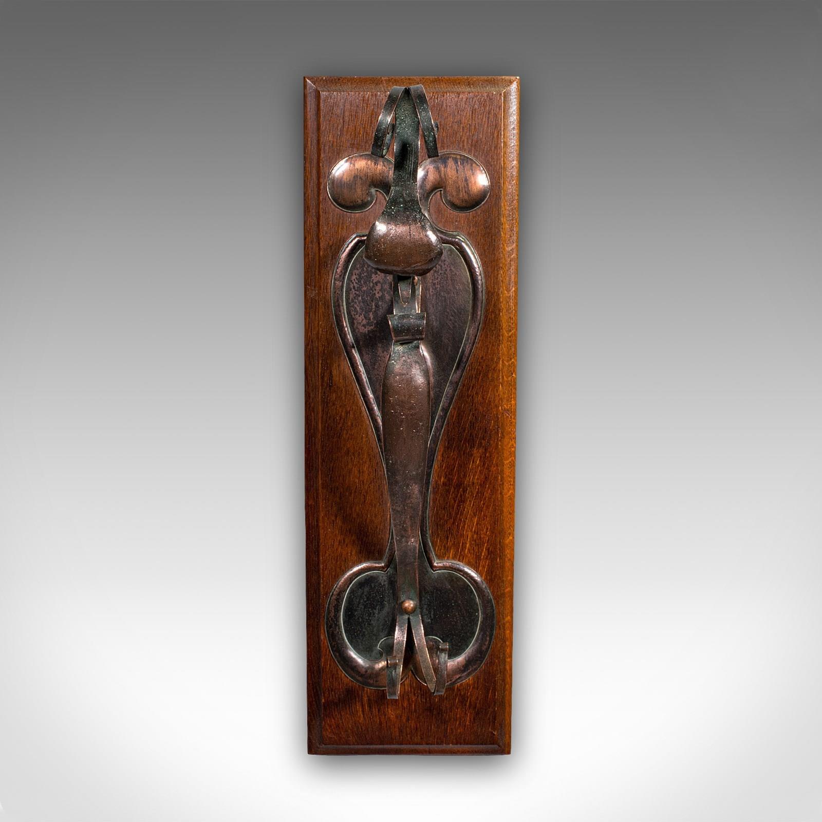 This is an antique wall gong. An English, oak and bronze dinner chime in Art Nouveau taste, dating to the late Victorian period, circa 1900.