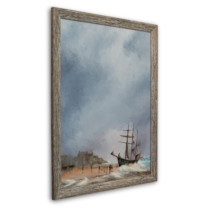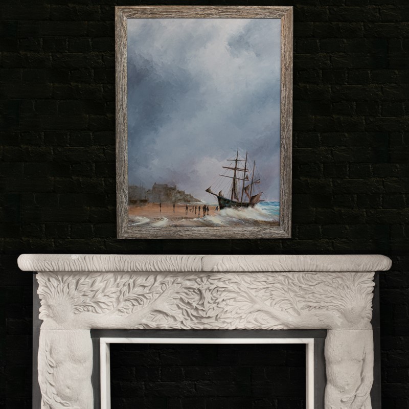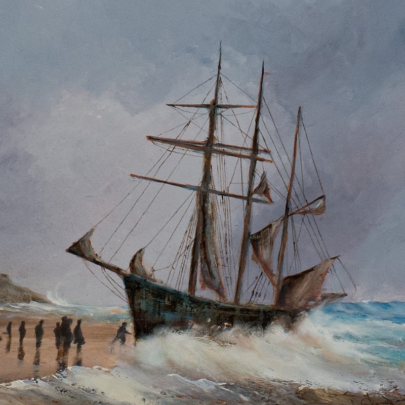 A wonderfully lugubrious sky rests over Porthminster Beach, in St. Ives Cornwall. A small ship is beached at the water's edge as a crowd gathers to watch the crew's attempt to reunite the vessel with the sea. The waves crash against the shoreline and crest just in front of the ship, whilst Cornwall's famous coastal waters show a hint of their aqua blue self to the right of the frame. At the rear of the beach, a couple of safely stowed ships reside in front of the headland, resplendent with buildings of varying heights.