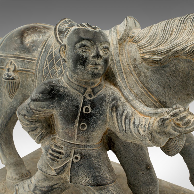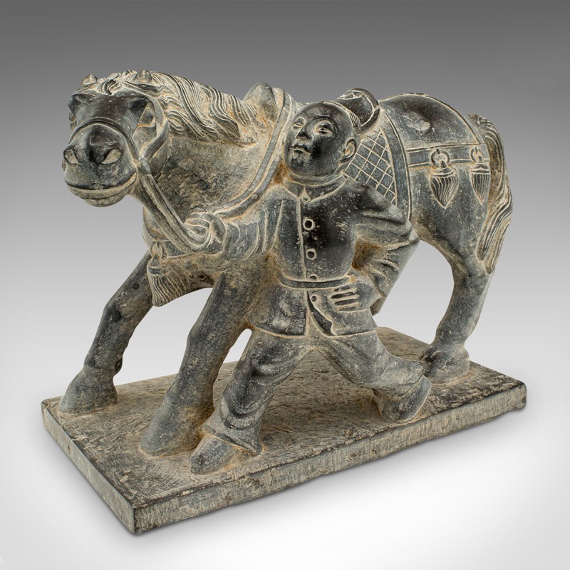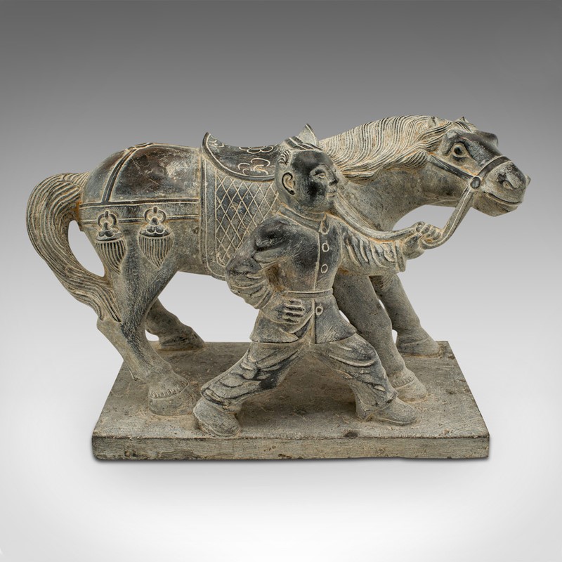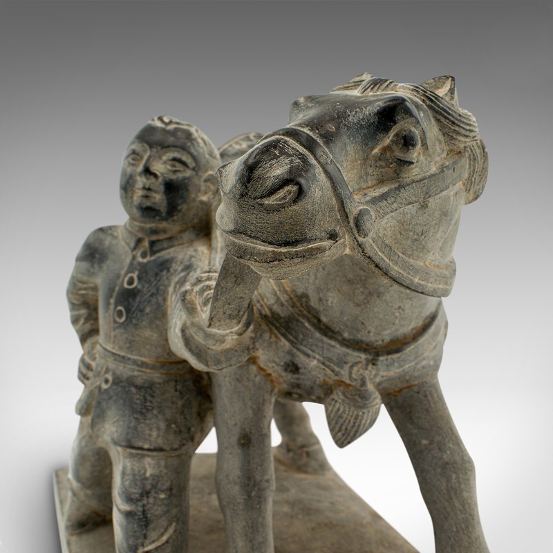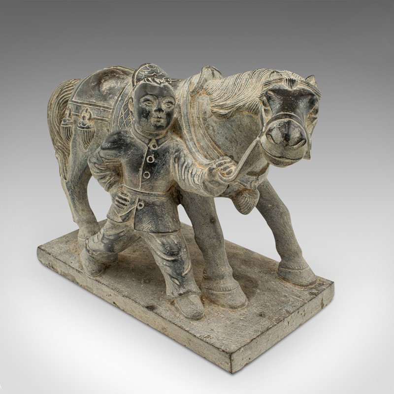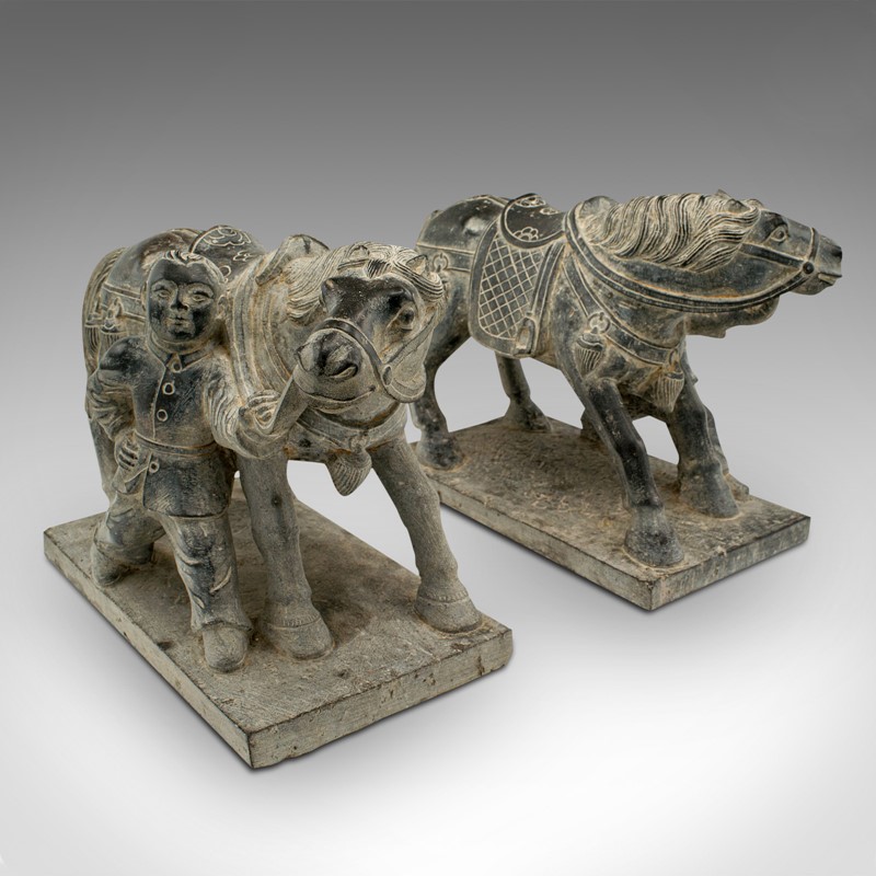 This is a heavy pair of vintage horse and groom figures. An Oriental, stone fireside ornament or bookends, dating to the late 20th century, circa 1980.