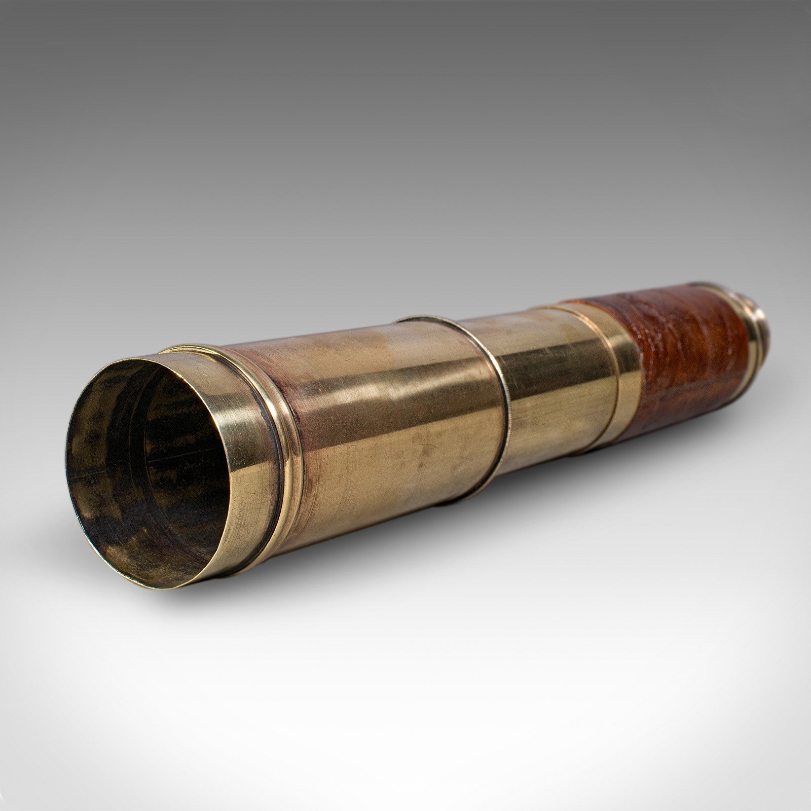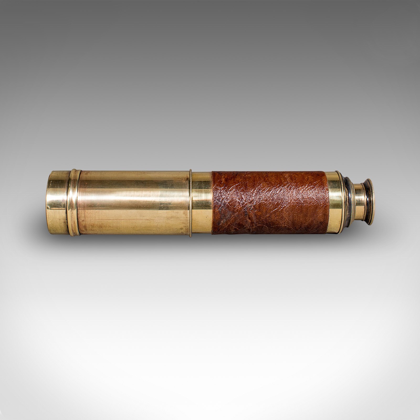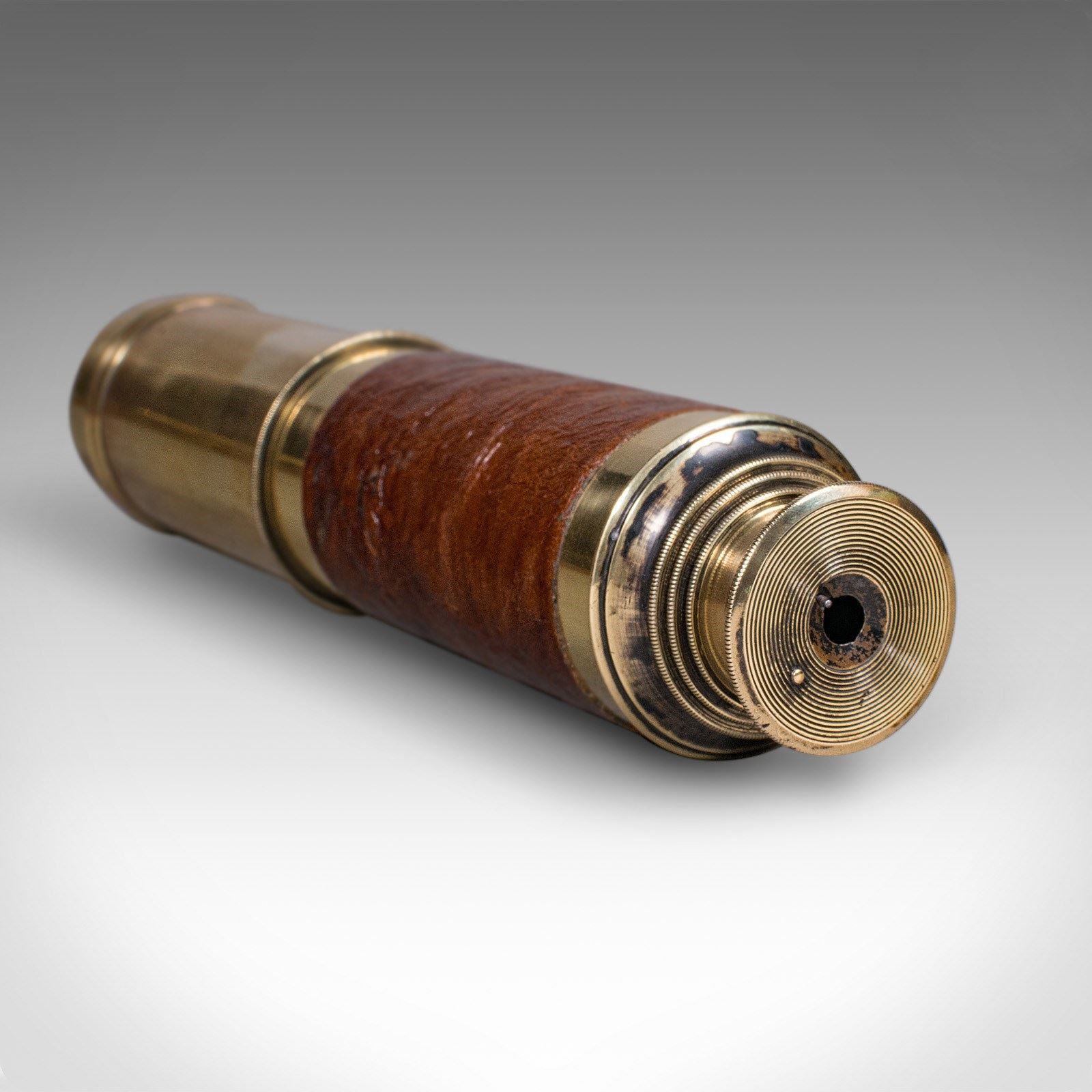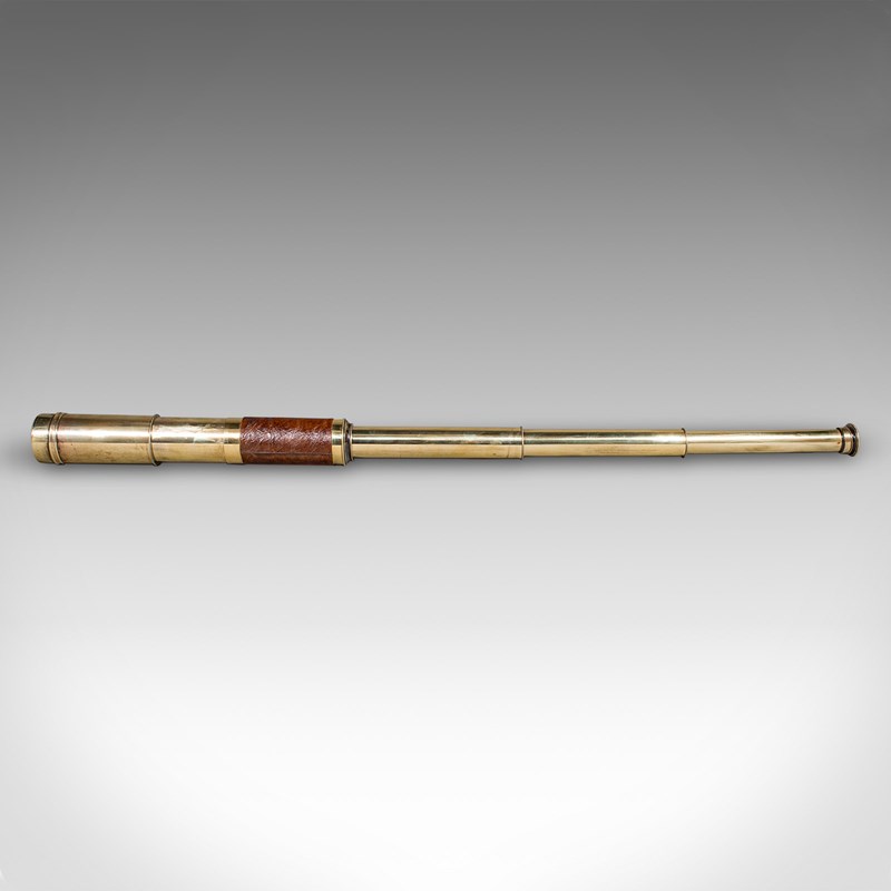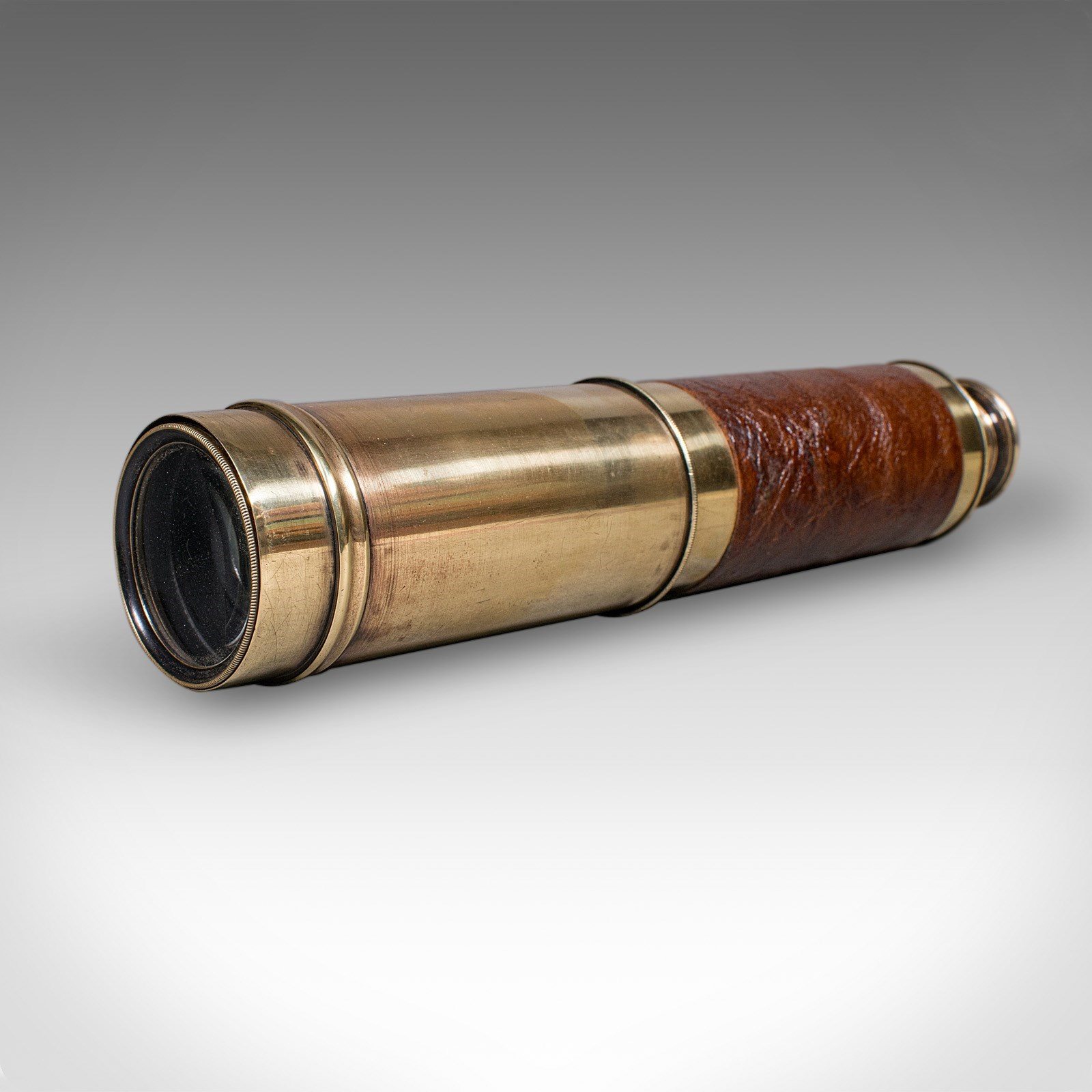 This is a large antique three draw telescope. An English, brass and leather terrestrial or maritime spyglass, dating to the Victorian period, circa 1860. Of excellent proportion and finish, this fine optical instrument presents with both practical appeal and decorative presence.