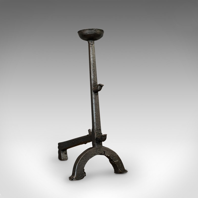 This is a charming antique decorative andiron, ideal for the larger fireplace as a period candle holder. Delivered polished and ready for the home.
