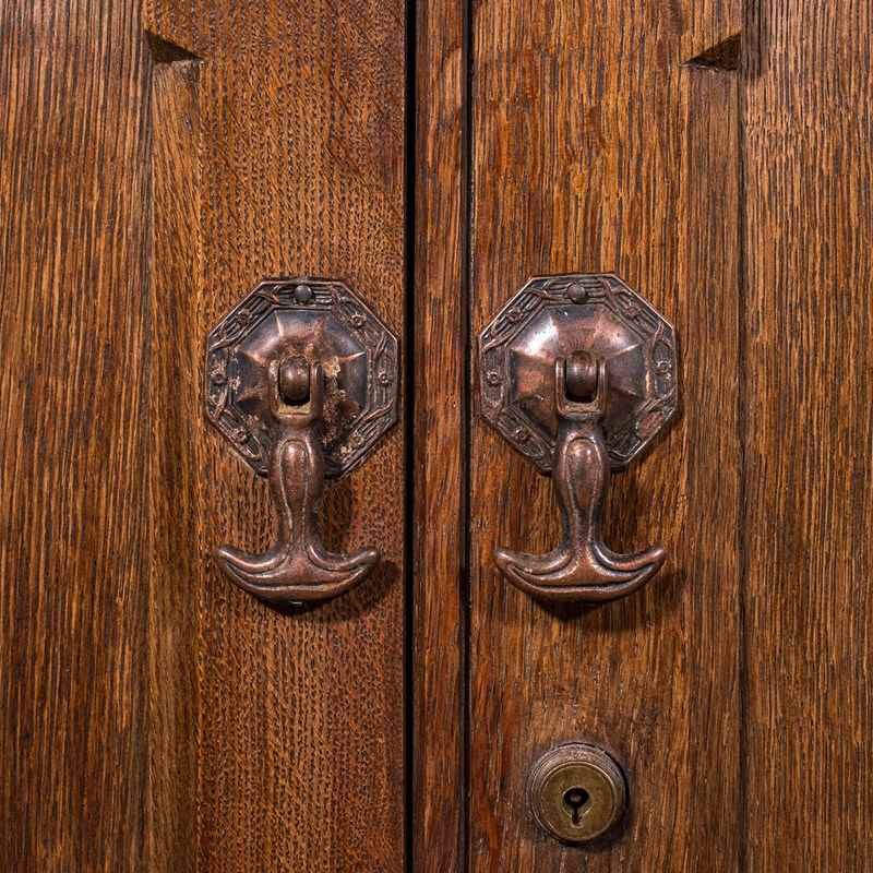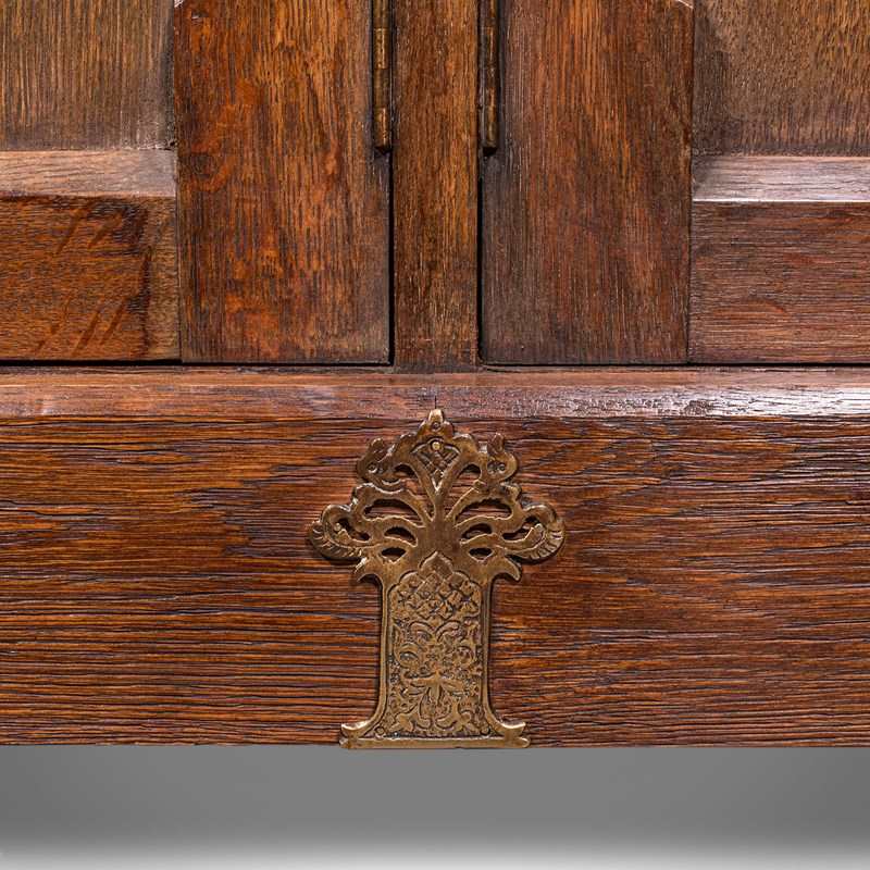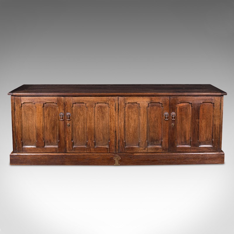This is a large antique dresser base. An English, oak Gothic revival ecclesiastical cabinet, dating to the Victorian period and later, circa 1870.