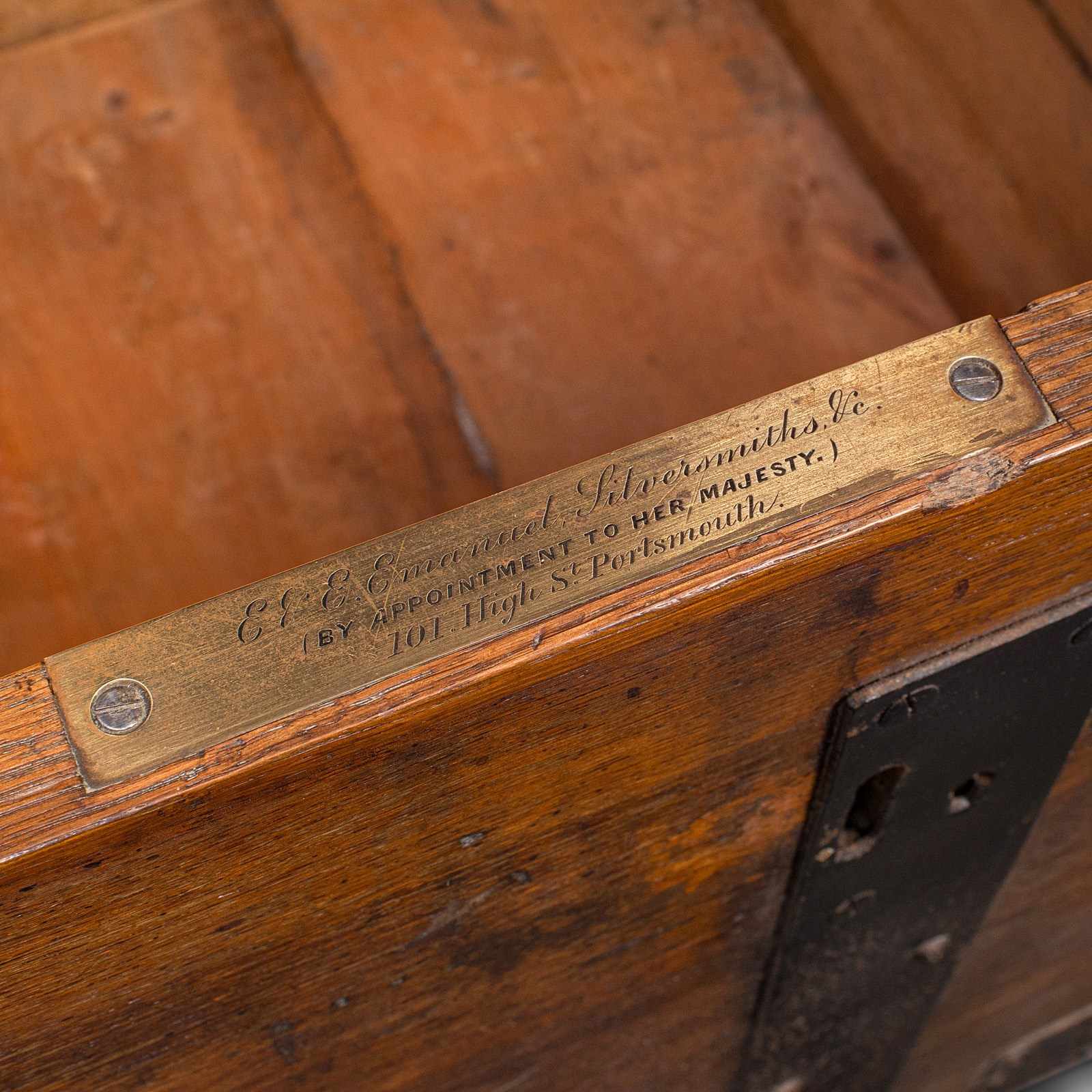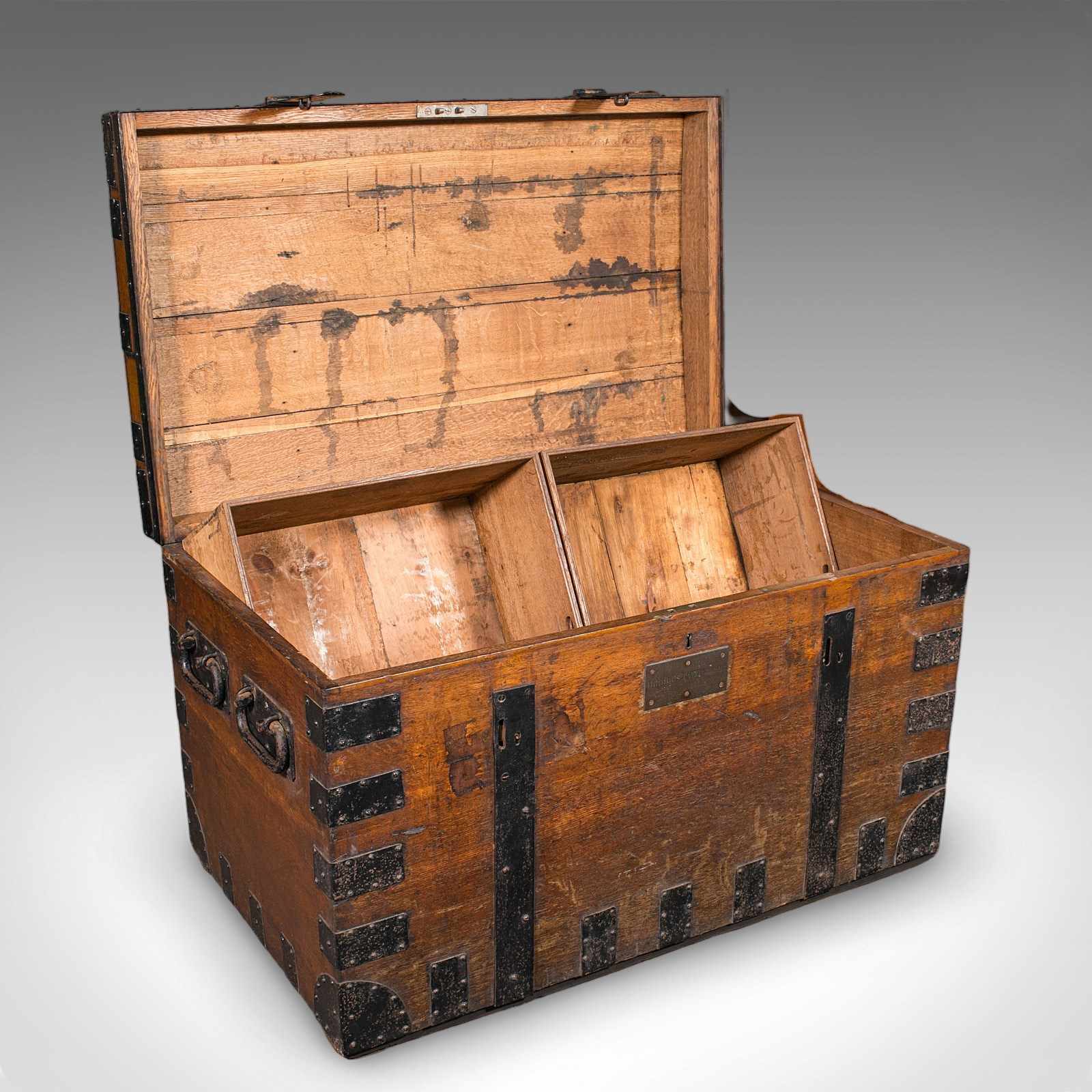 This is a large antique silver chest. An English, oak and cast iron bound shipping trunk, dating to the early Victorian period, circa 1850. An exceptional, substantial piece of Victorian craftsmanship with distinguished provenance.