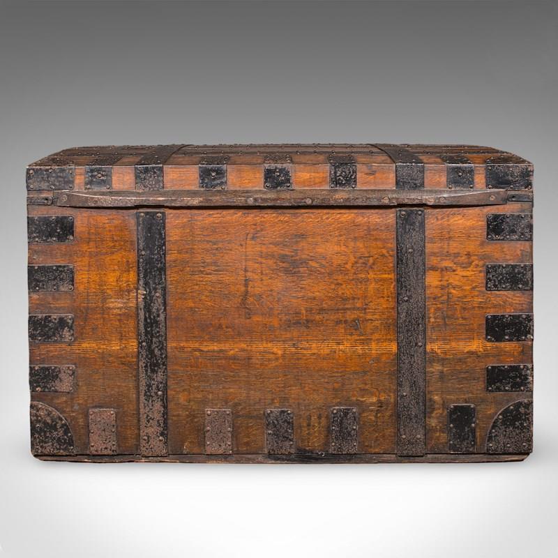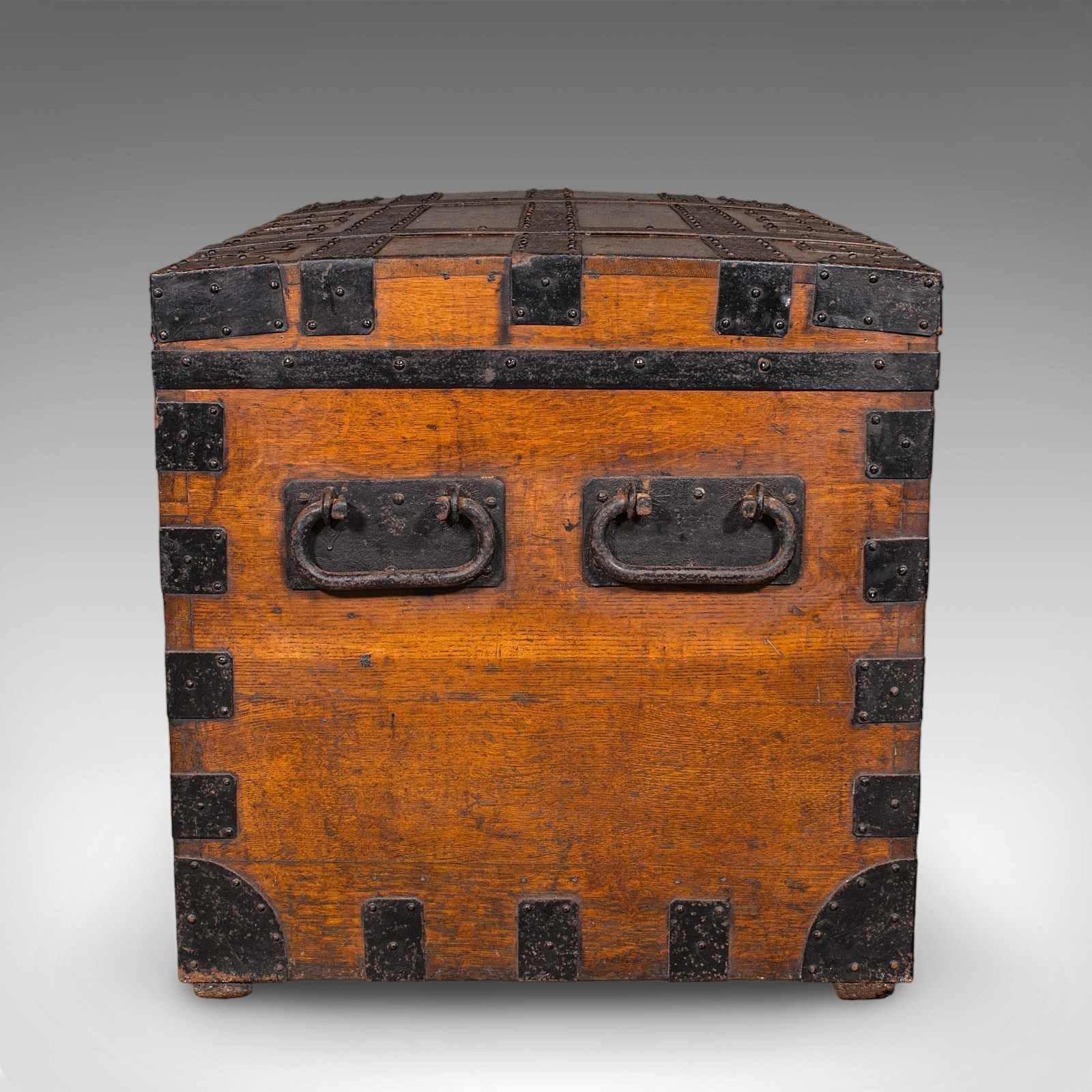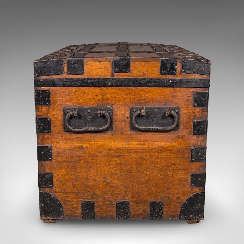 This is a magnificent oak and cast iron shipping trunk, offering outstanding character, provenance and decorative presence for the collector, study or refined interior. Solid joints and construction, delivered ready for the home.