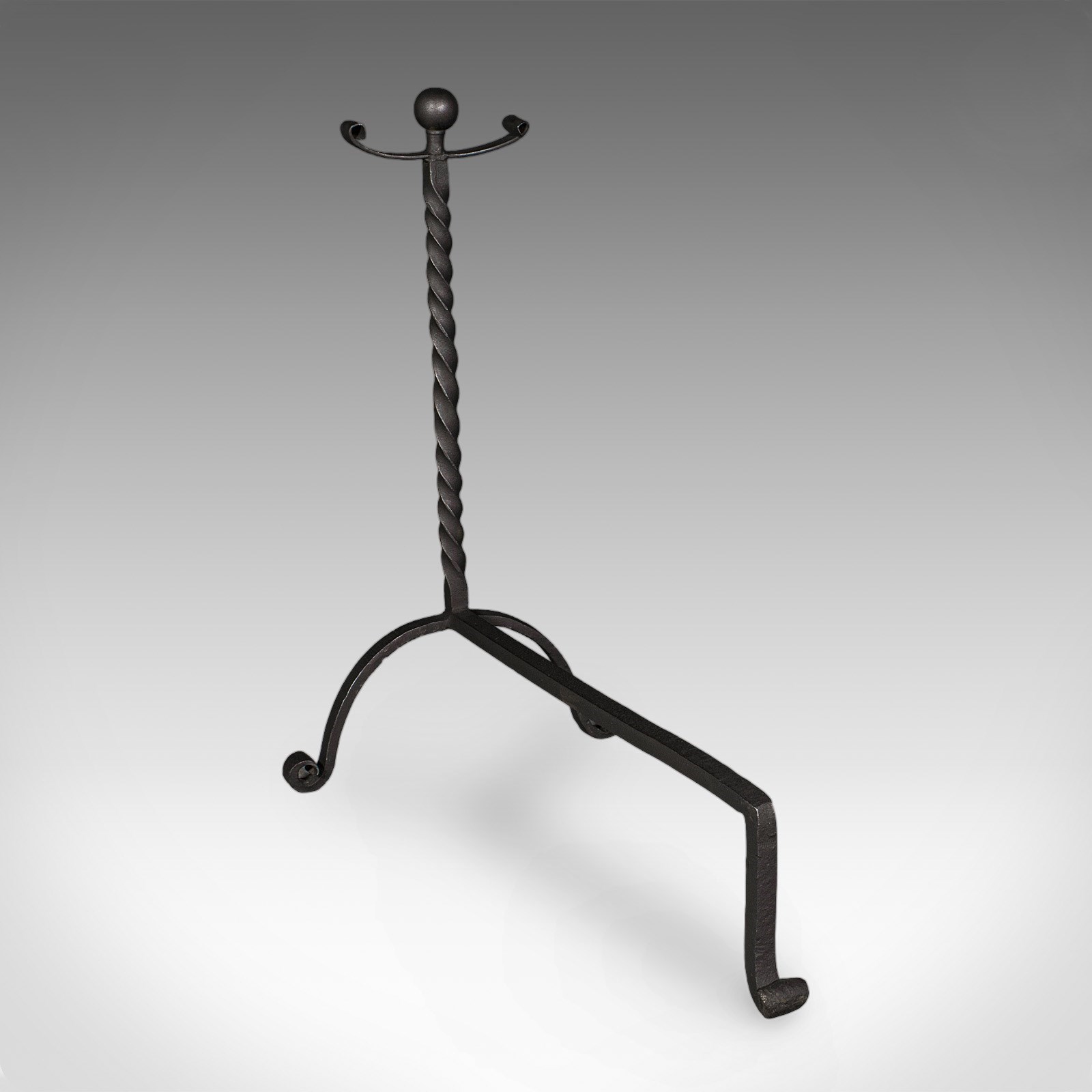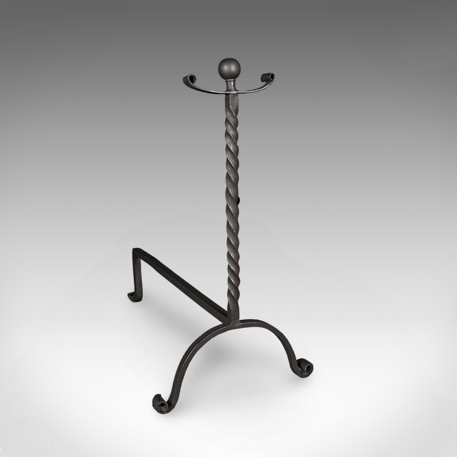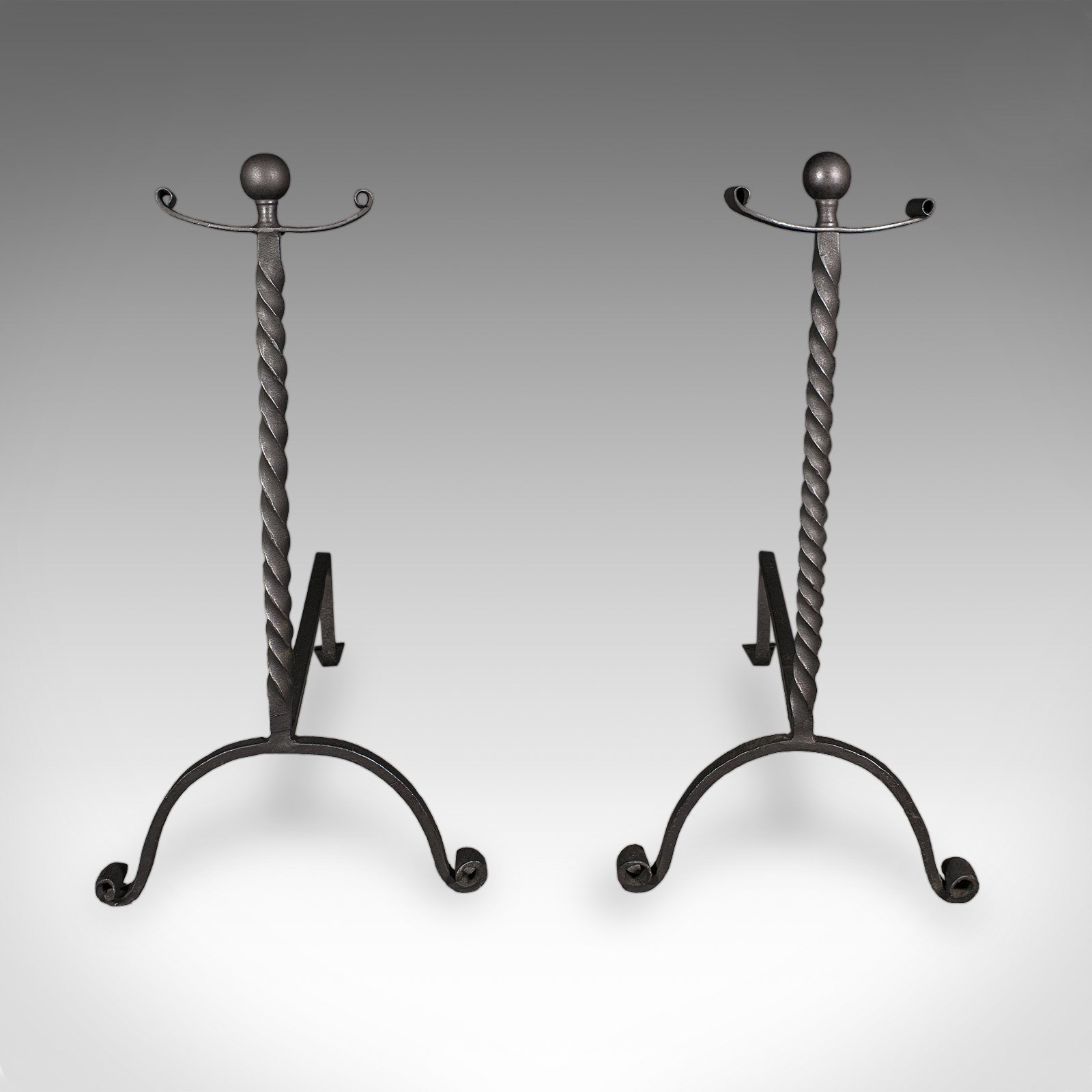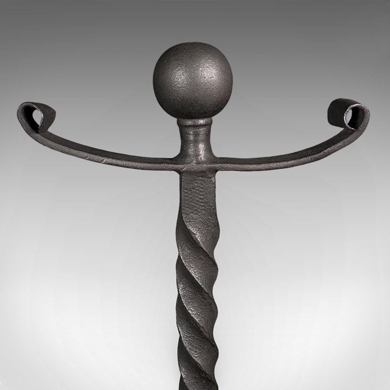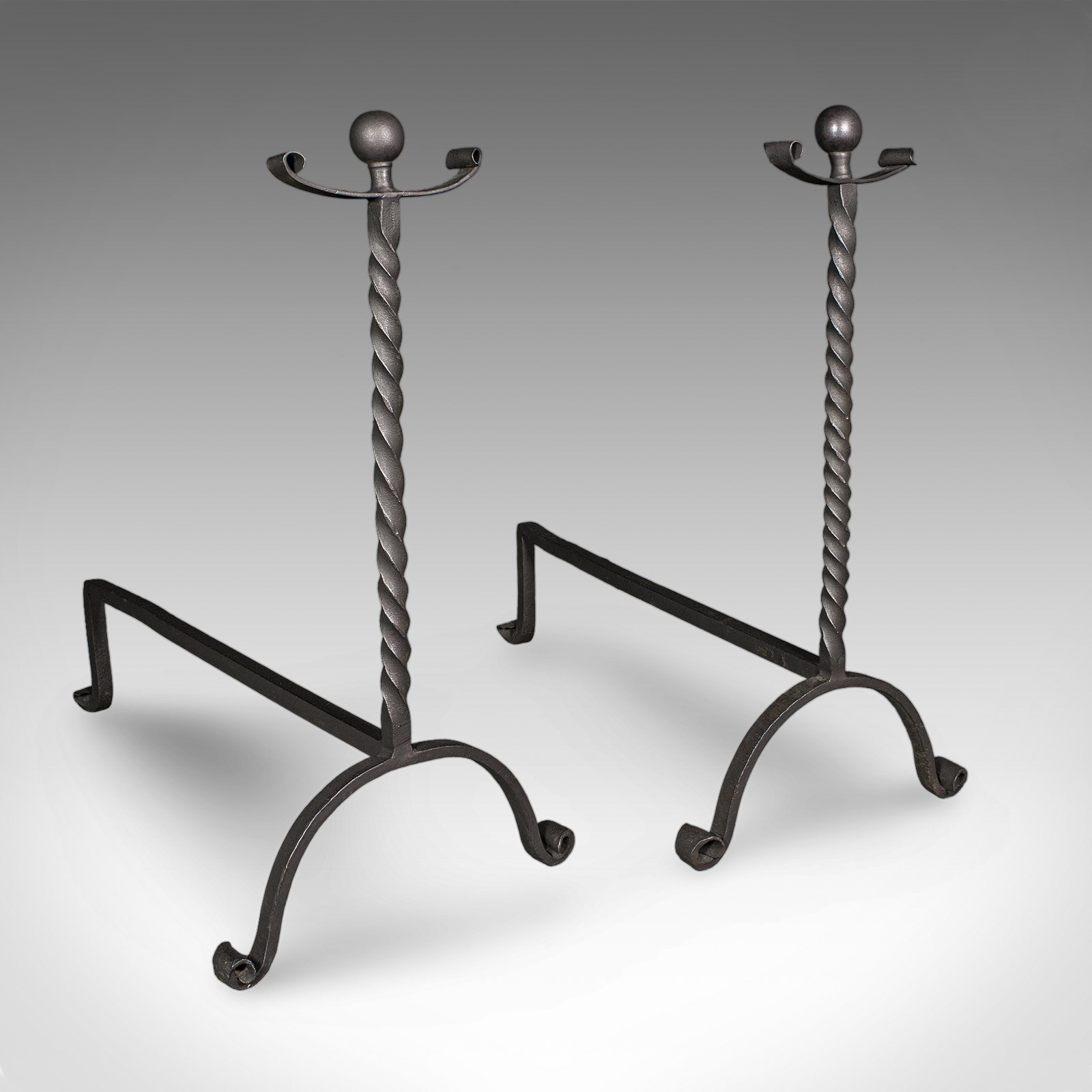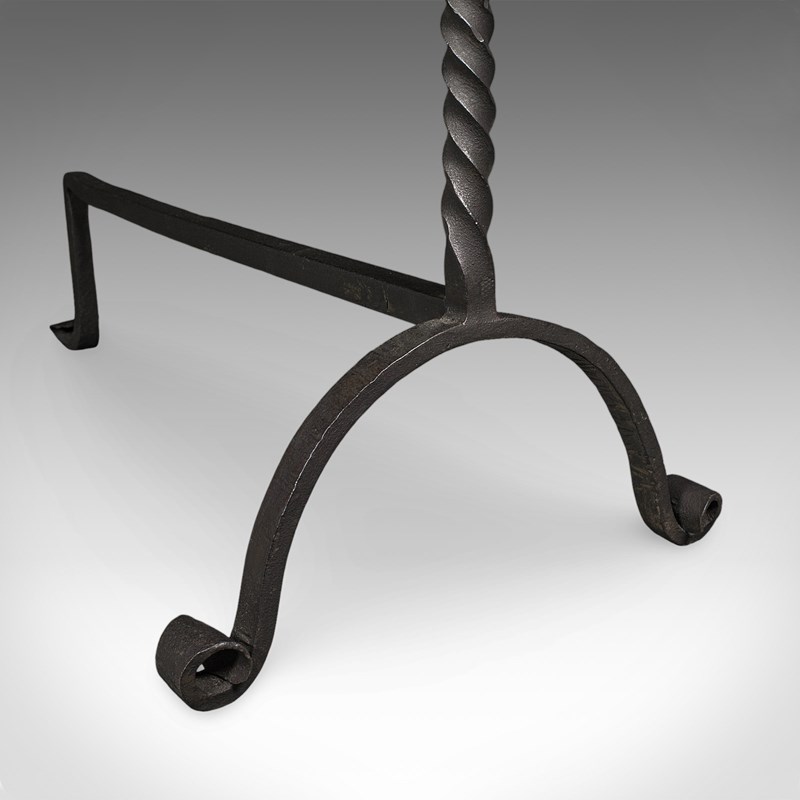 This is a smart pair of antique andirons, with appealing twist detail and of useful size for larger fire baskets. Delivered ready for the home.