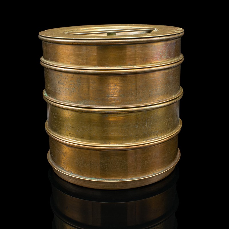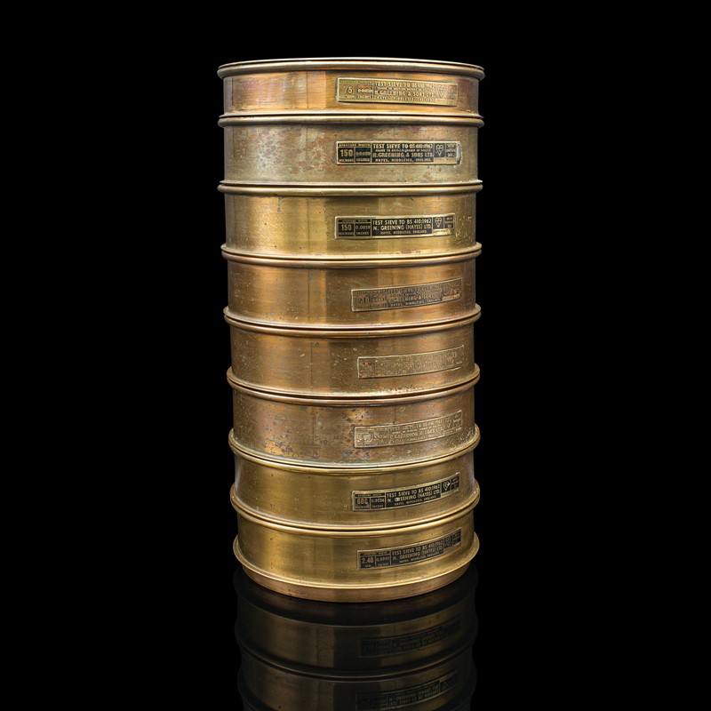 Large Set of 8 Vintage Lab Sieves, English, Brass, Stacking, Scientific, C.1965