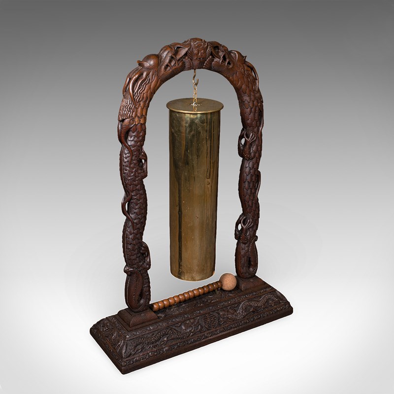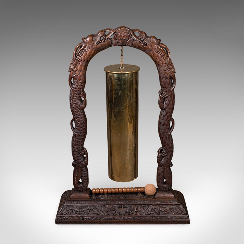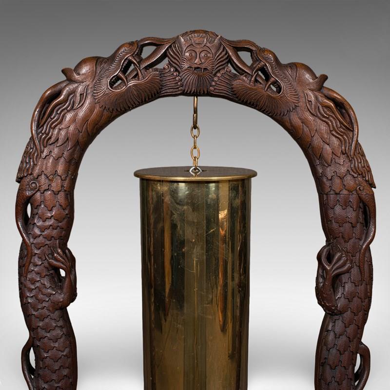 Large Vintage Alarm Gong, Oriental, Hardwood Chime Stand, Brass, Art Deco, 1930