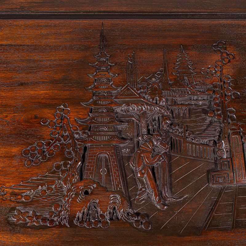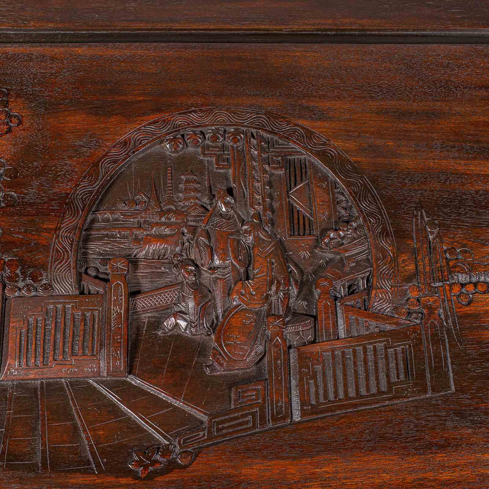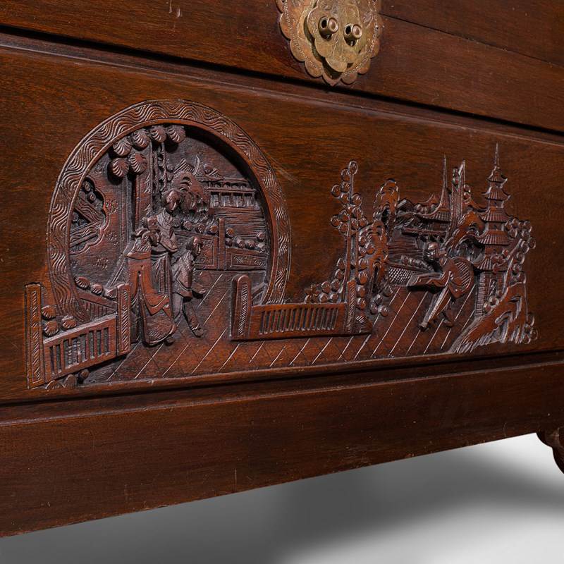 Lid and fascia adorned with a superb carved figural frieze, showcasing traditional Oriental motifs