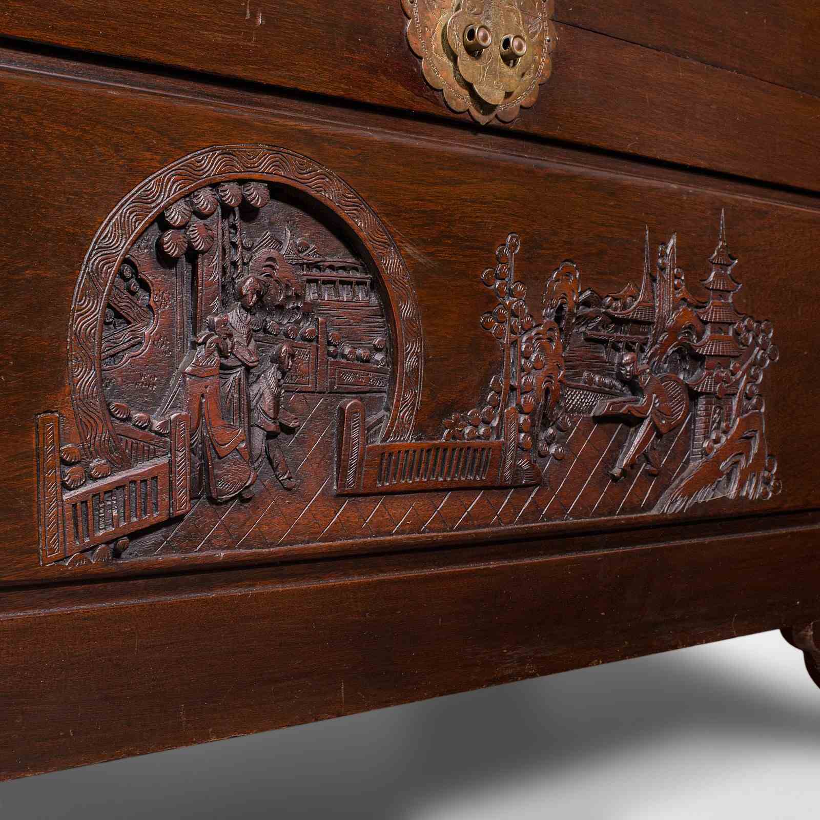 This is a large vintage carved chest. A Hongkongese, camphorwood storage trunk, dating to the mid 20th century, circa 1950. A fine example of Oriental craftsmanship, with rich colour and ornate carved detail.